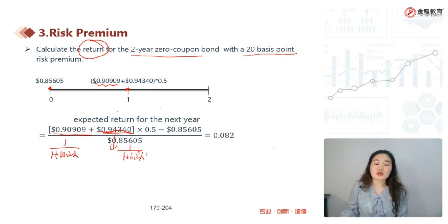 已解决老师,这个地方算收益率为什么折现到1时刻的价格不需要加上risk premium? 如果解释说是因为站在1时刻两个利率6%和10%已经代表spot rate那么我认为即期利率应该就是固定的,怎么还会出现两种情况?麻烦老师解释一下