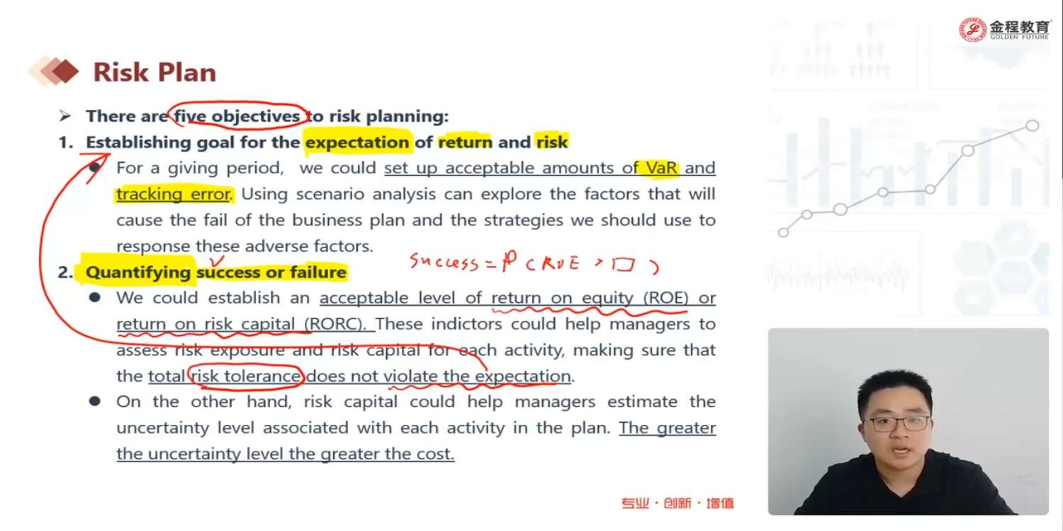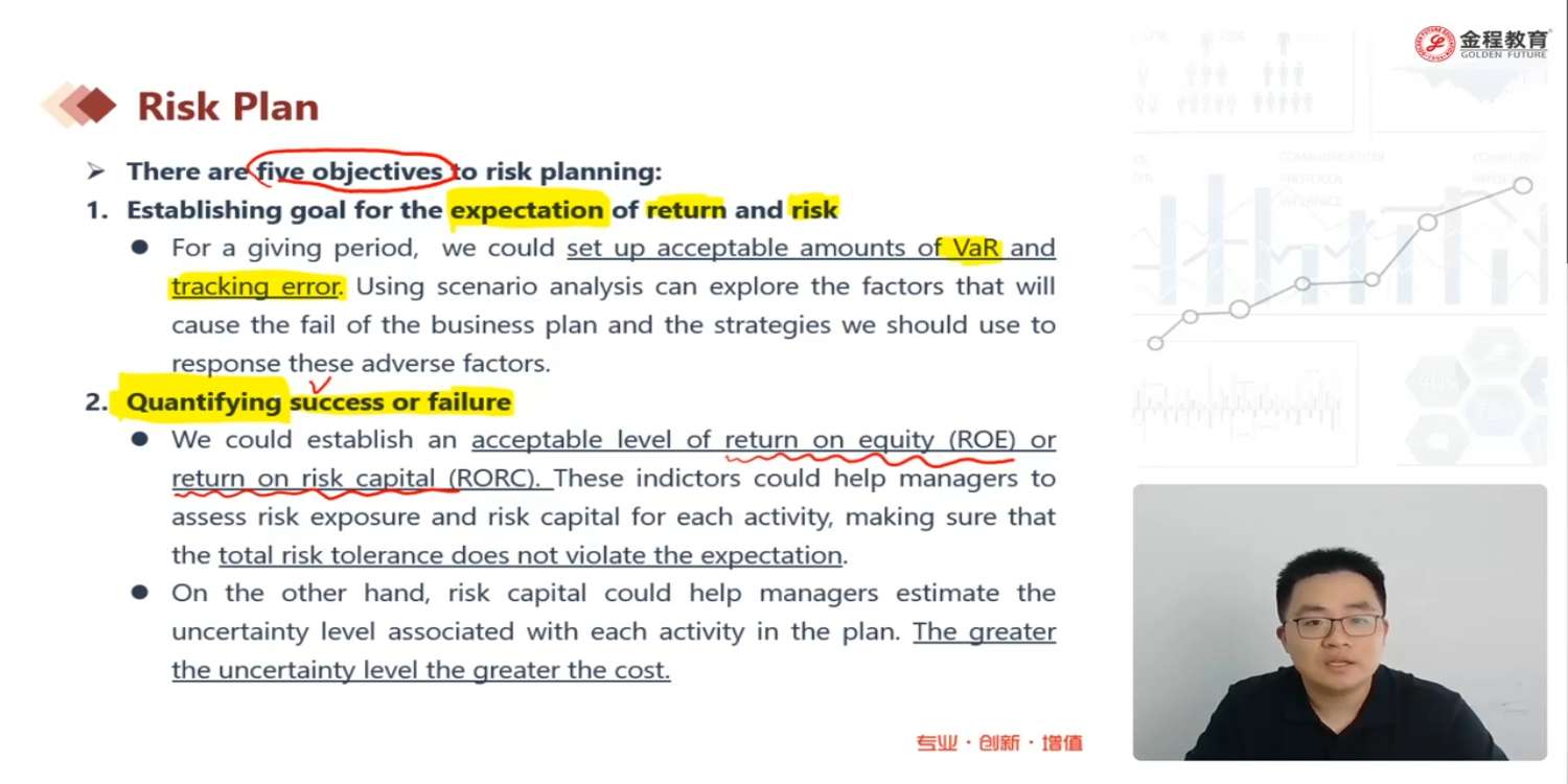 老师,这一页最后一句话,老师说降低风险是需要花费成本的,那这里讲义上说the greater the uncertainty the greater the cost表示的意思是不确定性越高,我要降低不确定性所要花费的成本也就越高对吗