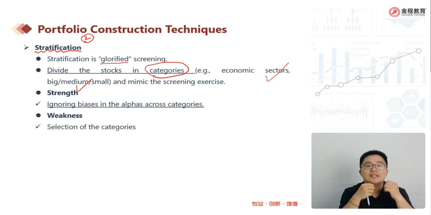 老师,这个分层抽样法优势是资产不会过度的集中在某些大类,那讲义里说strength是ignore biases in the alpha across categoies跟老师说的优势有关系吗?