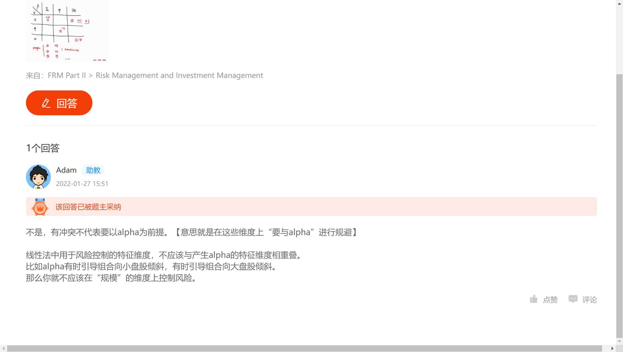 FRM问答包含在线课程、FMR通关课程、FRM试题等所有FRM相关问题,每个问题老师均会在24小时内给出答疑回复哦!
