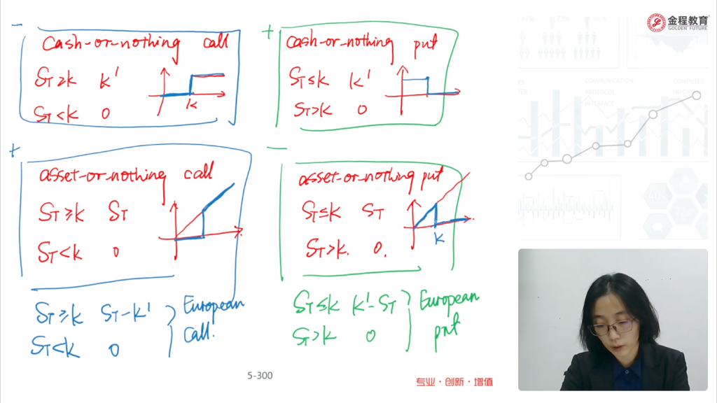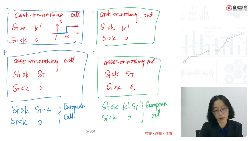Asset or nothing call 为什么是获得St,不是St-k呢?图像里call和put直线都是向上倾斜,我觉得put看跌应该向下倾斜。