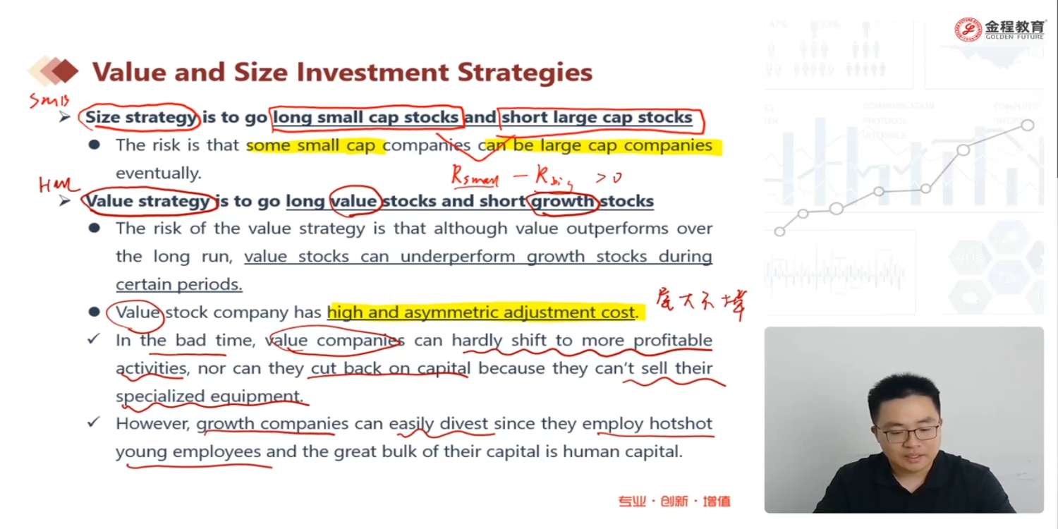 请问老师,市场上有很多股票,同时具备small cap和growth的特性,比如科技类股票,另外一些兼具big和value的特性,比如银行股,那么size strategy和value strategy在bad time时,small亏损而growth盈利,big盈利而value亏损。两个策略是否矛盾,该怎么理解。