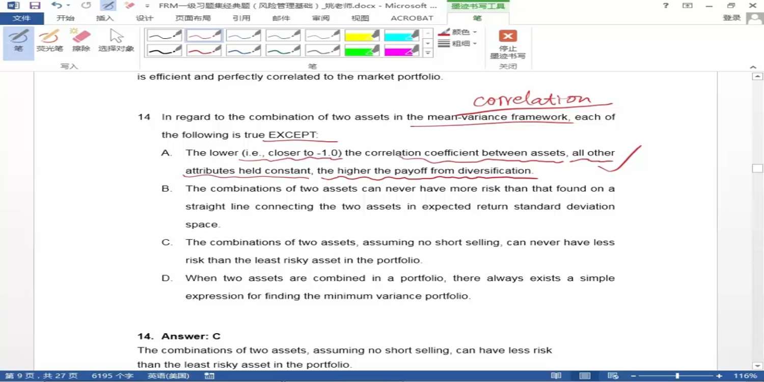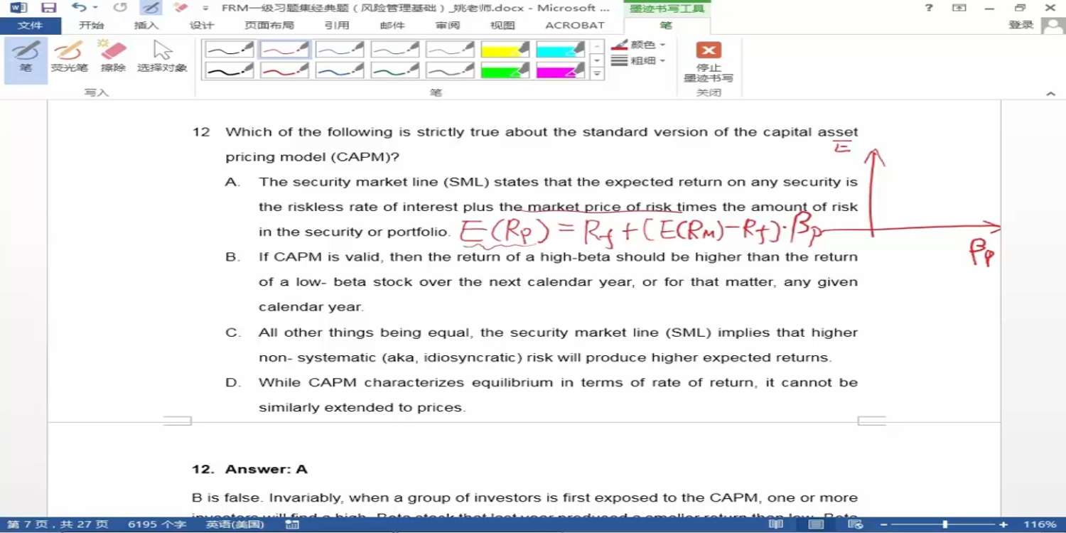 13题,解释的真不清楚啊,CML和SML区别是什么呢?主要从两个分散化和是否有效来解释吧。强化课老师讲CML是总风险sigma p,是含着非系统性风险,那就不是分散化的啊,SML是系统性beta p 是分散化的啊。是否有效方面应该都是有效的吧