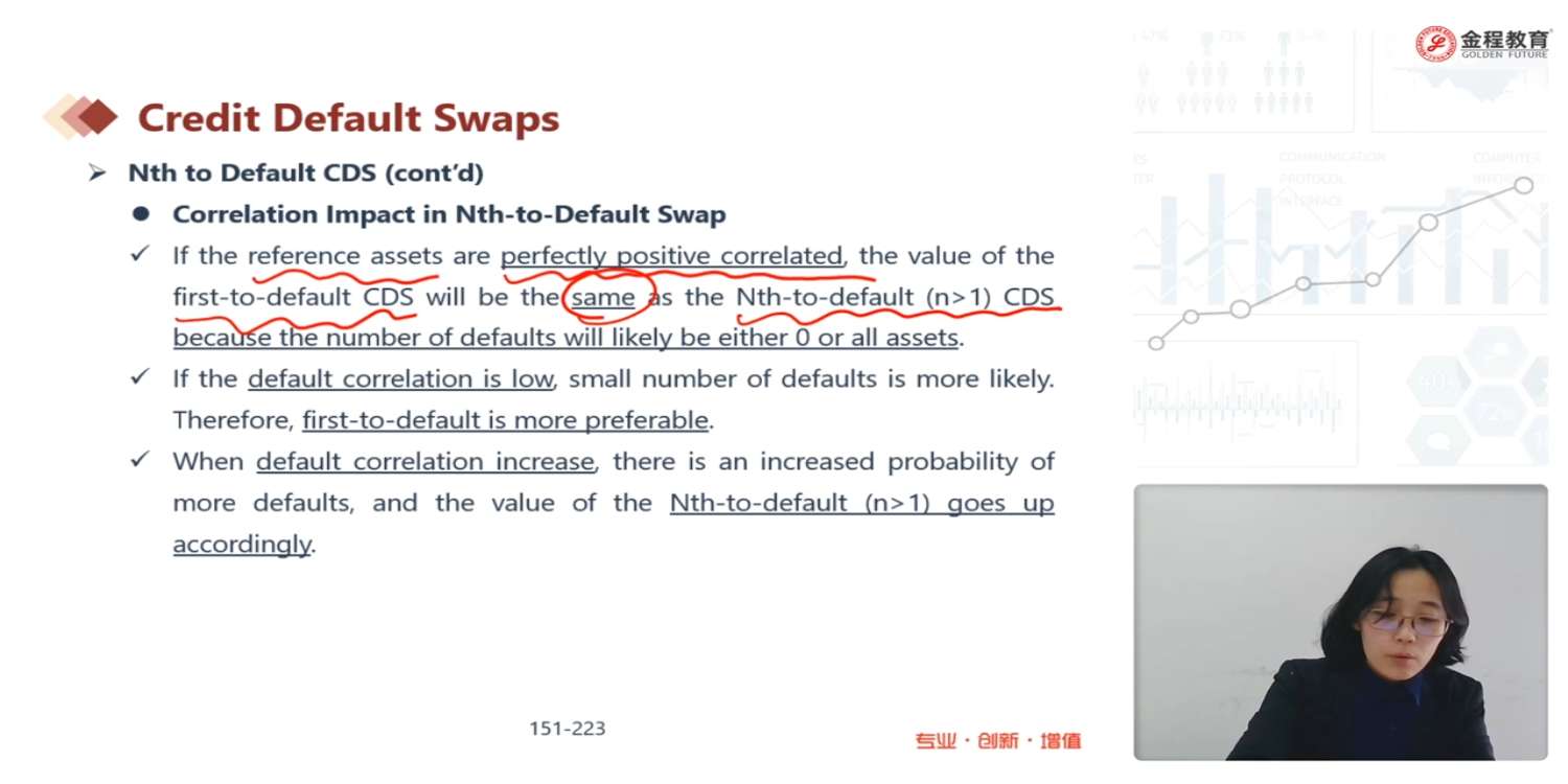 老师好,截图中如果相关系数是1,nth 和1st价值一样,这个是不是建立在多个资产组合中,单个资产价值相同的情况下,因为nth违约的价值比1st违约资产价值高,那还是nth得赔付高吧