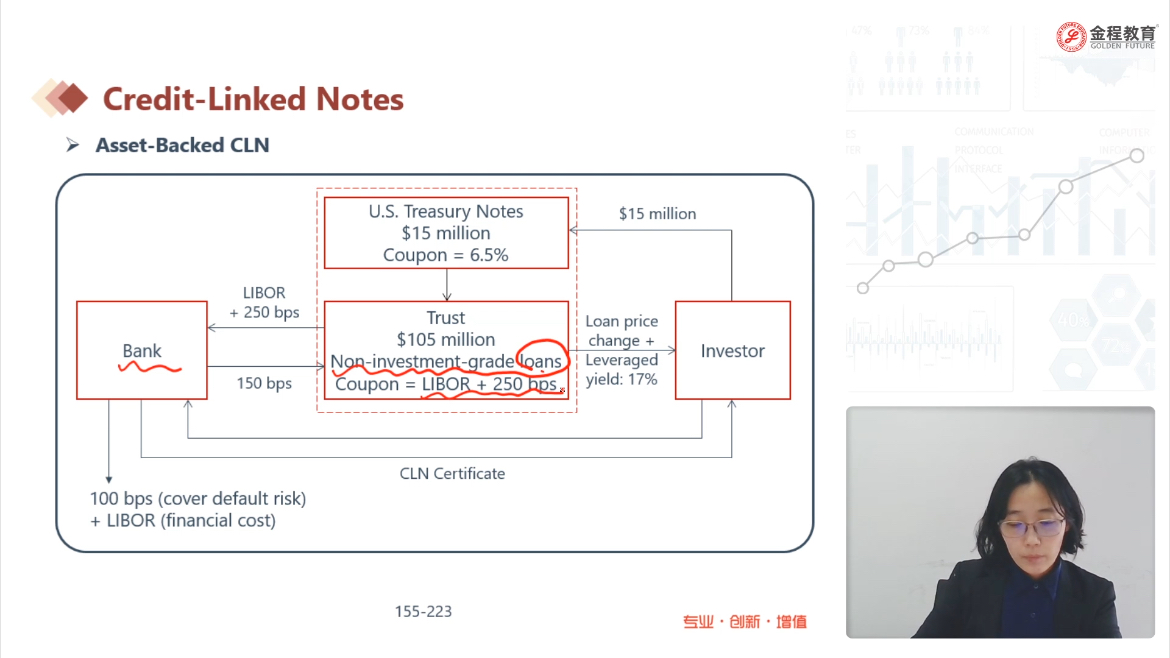 這個例子裡 銀行都付了保費給Trust 。 1:為什麼還有Libor+250 bps? 銀行的角色是做了個CDS買了個保障,竟然還有錢收嗎? 2:而這個Libor+250 bps又是怎算出來?