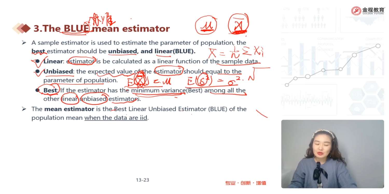 请问Best这个概念,是指eg所以样本均值与population mean的方差最小是最好,还是每一组样本分别各自的方差,最小方差的一组样本算出来的均值是population mean的best estimator呢?