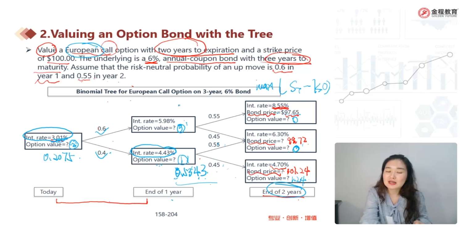 老师,这个题目表述的有点奇怪啊,翻译过来是说:其中1年期债券第二年的利率预期为8%、6%或4%,而零息债券第一年的利率预期为7%或5%。这这个图文不一致吧,虽然我知道根据图上描述的是怎么算的