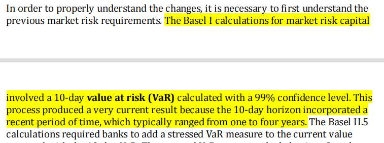 NOTES里关于巴塞尔I中关于市场风险资本计算有一句话, 后半句无法理解,明明是10天VAR跟 typically ranged from one to four years有什么关系呢