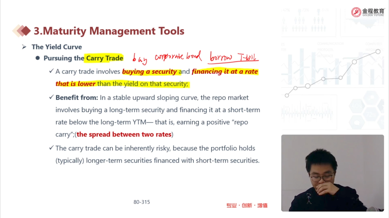Riding the yield curve是不是可以这么理解,因为interest rate 是upward sloping,所以五年期利率是大于四年期的利率。因此我买入一个五年期的债券一年后卖出赚的是五年期的利息以及四年期限的现价,这个利润是大于四年期的债券过了一年后的现价和利息。那这个四年期的债券是否是持有在买入五年期的债券的时候。我这么理解riding the yield curve是对的吗