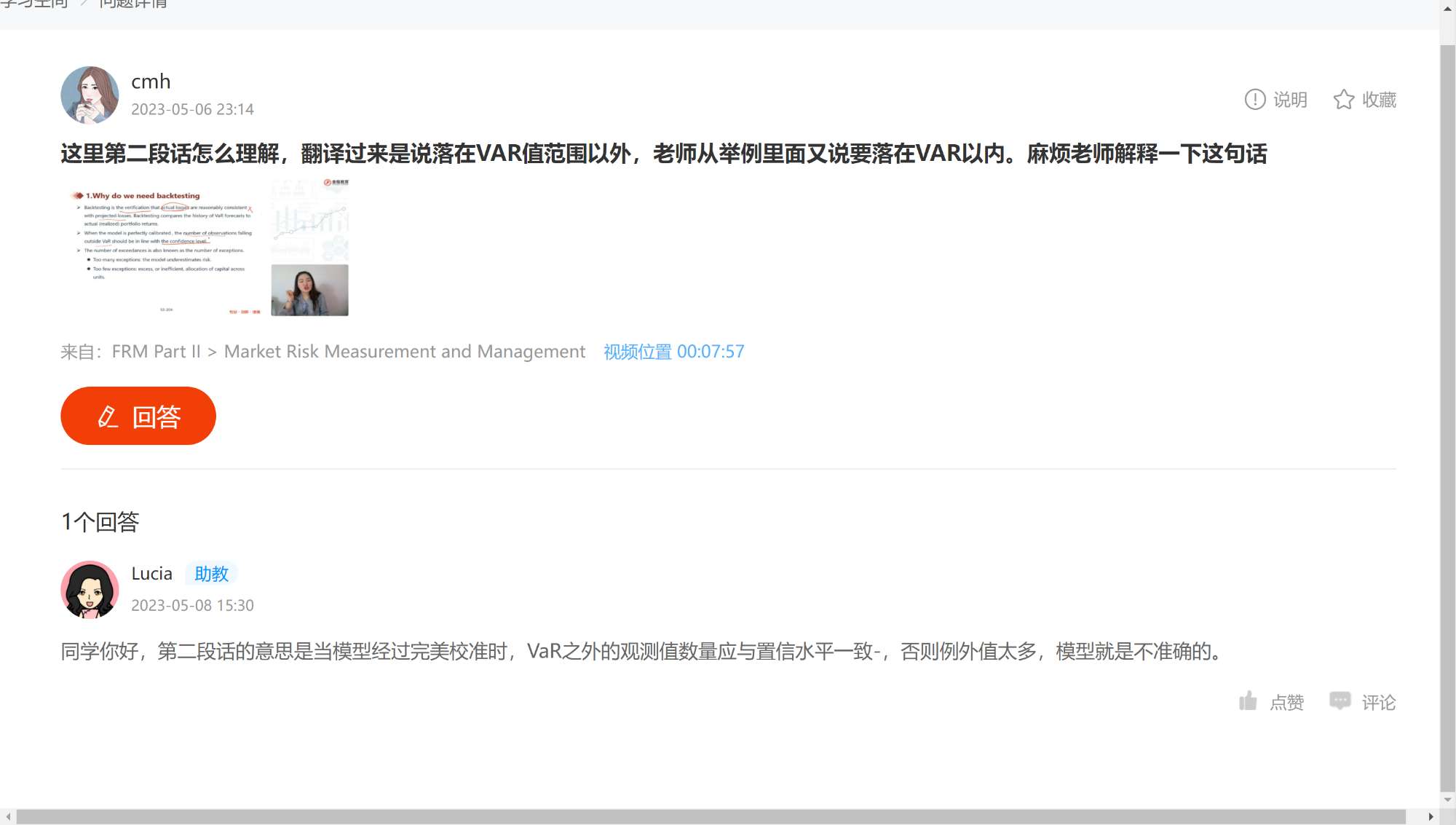 FRM问答包含在线课程、FMR通关课程、FRM试题等所有FRM相关问题,每个问题老师均会在24小时内给出答疑回复哦!