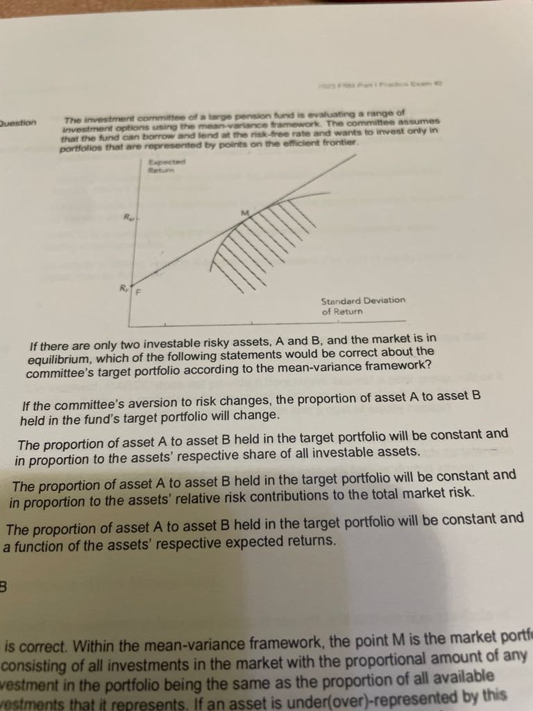 亲,这题我没看懂。按照CML来,所有投资都在这根线上。但市场组合M就已经是全市场所有风险资产的组合了。所以问题问的A、B在哪儿?是问在M点内的比例还是在CML上其他的点?