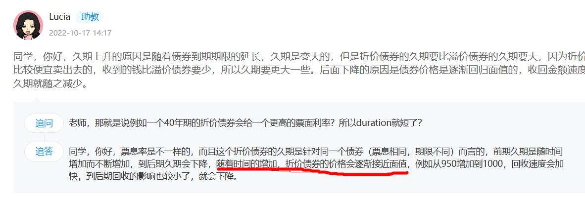 老师您好,我想详细知道为啥折价债券的久期随后会下降,图二的文字解释:折价债券随着时间的增加,价格会接近面值是什么意思,折价债券的价格难道不是早就定好了吗?若按这种解释,为什么溢价债券随着期限的不断增长久期不会下降?