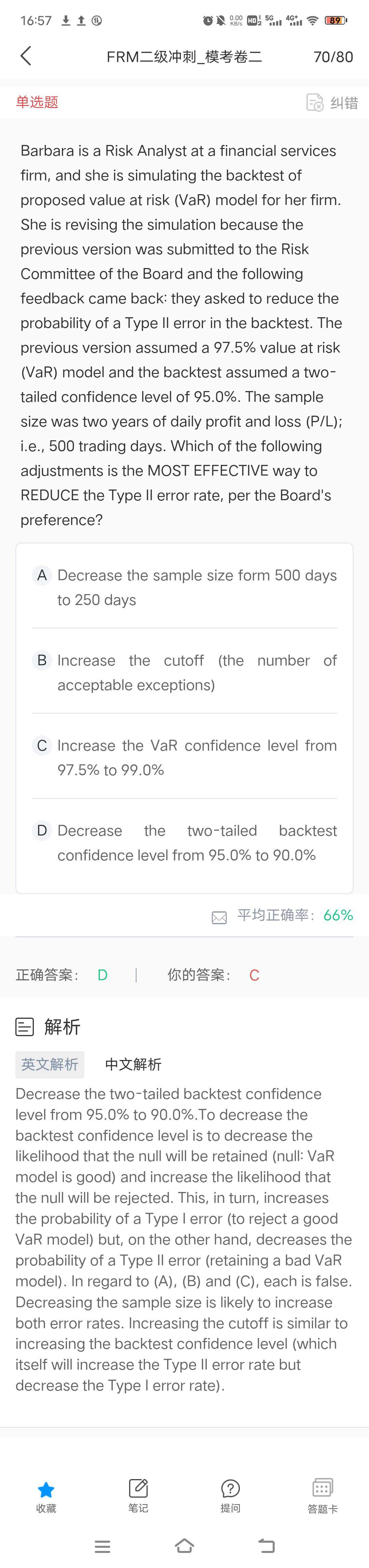 老师好,请问这个解析里面说的在95%的置信水平下,落在预测范围之外的观察值【不应超过1个】 (期望值仅为观测值的一半)。在此模型中,有两个观测值超出了预测范围,这与95%置信度不符。 该模型与回测结果不相符。回测只适用于未发生重大变化的投资组合。【不超过一个】是通过exception=np=10*0.05=0.05约等于出来的这个1吗?谢谢