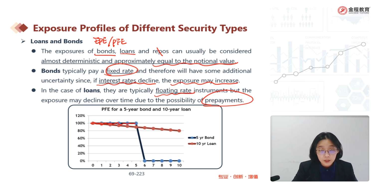 1. 此页中的图表PFE为纵轴,单位为何是%? 2. 贷款Loans未来敞口预计会decline是因为prepayments,但债券的利息不也相当于prepayments么,为什么未来敞口不预计下降呢