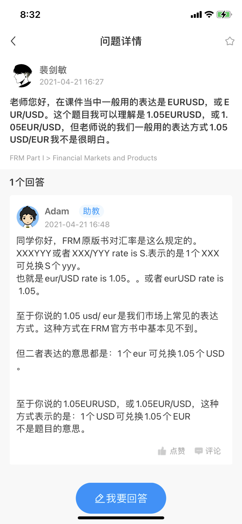 FRM问答包含在线课程、FMR通关课程、FRM试题等所有FRM相关问题,每个问题老师均会在24小时内给出答疑回复哦!
