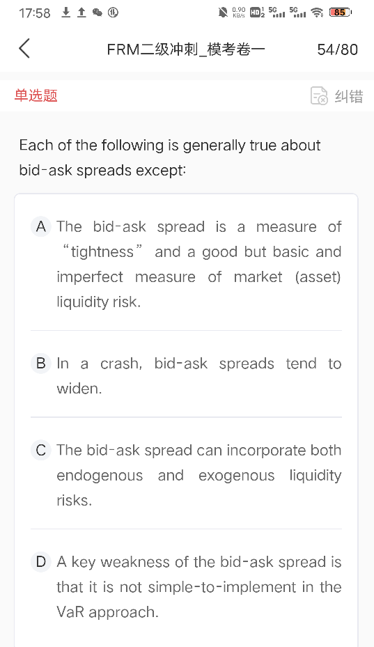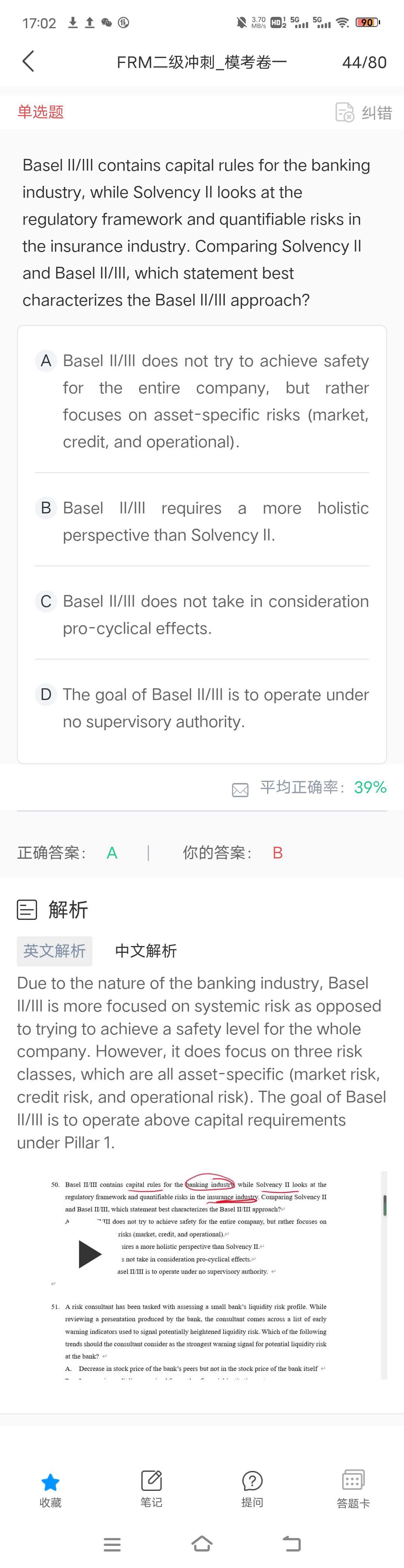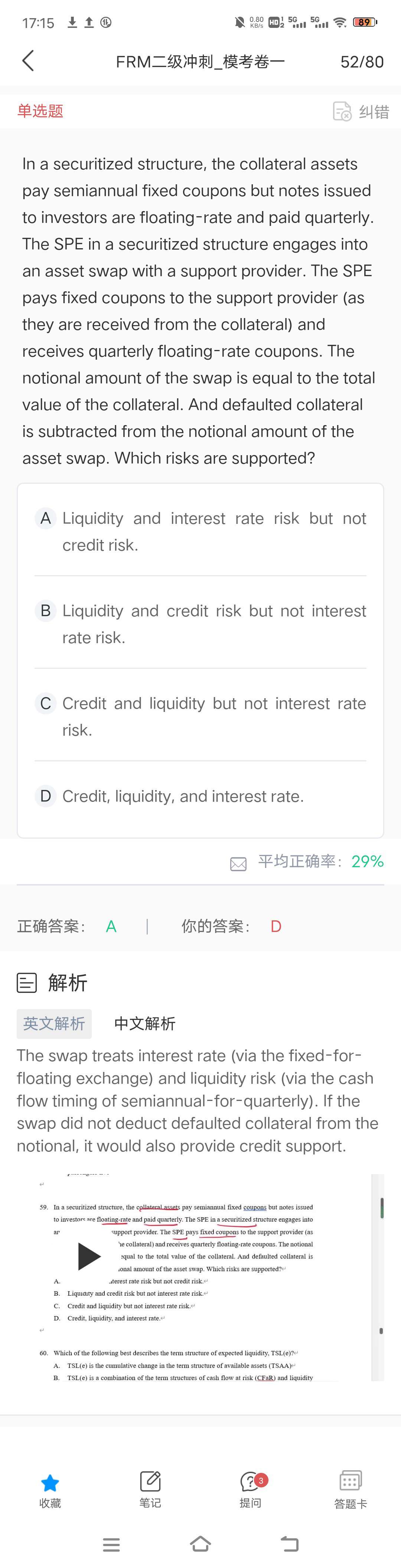 请问老师,我觉得这题答案应该是d,如果按照答案解析的逻辑,流动性和利率风险是完全对冲的话,其实是默认swap的对手是不违约的,在这个前提下,流动性风险和利率风险才是完全对冲。也就是说,若果存在交易对手风险的话,流动性风险和利率风险不能是完全对冲