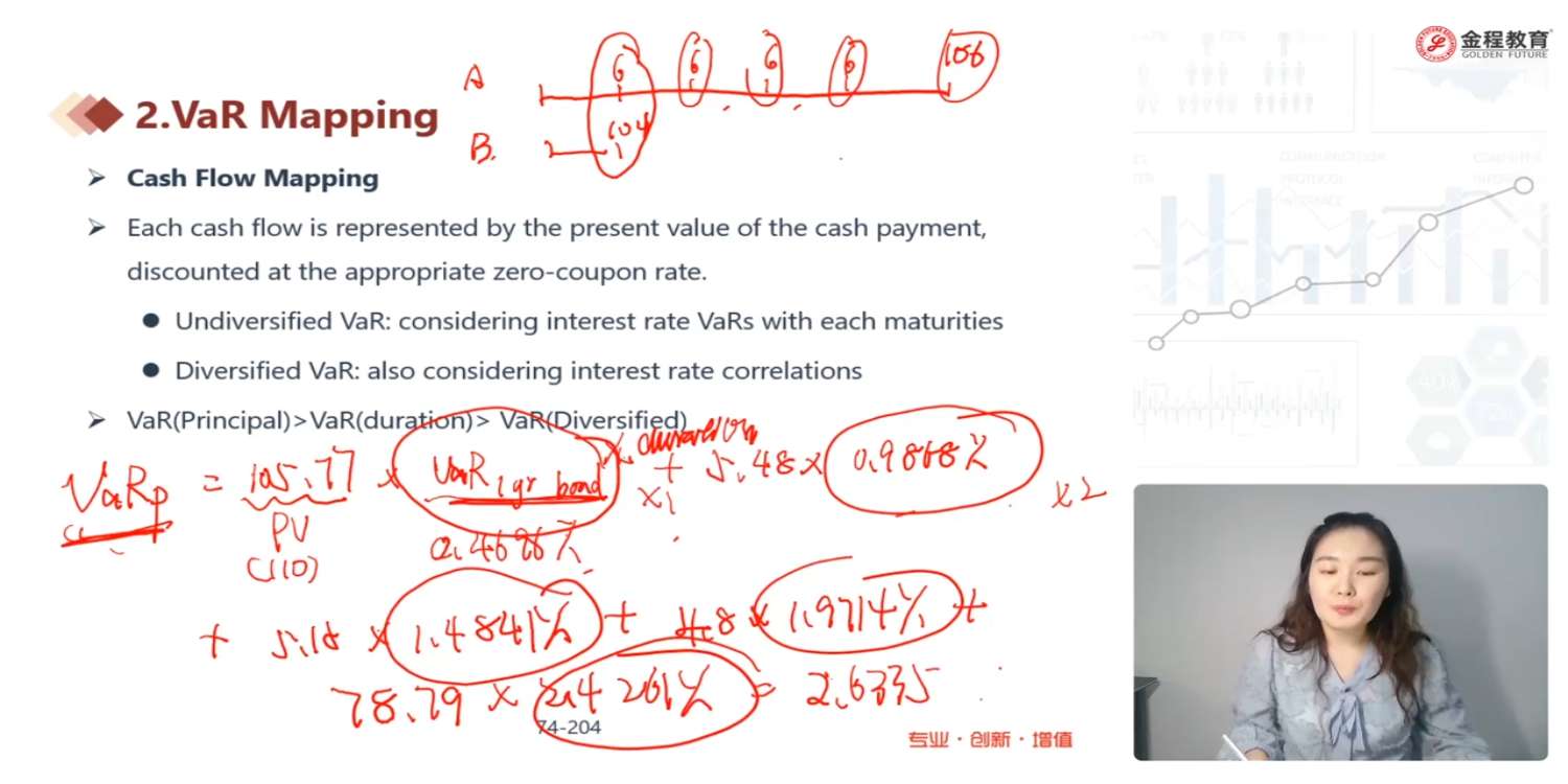 请问讲的那个利率乘以久期乘以本金算var这种能再讲一下吗?书上是用interpolation算的2.733年对应的百分比的Var,也不是乘以时间这种。讲义的这个公式VaR(portfolio)=3*VaR(3-yr int)*200M就有点不明白前面为什么有那个3?上面的VaR(portfolio)=1.484% × $200 = $2.97million也不是乘以时间啊?或者就说用乘以时间的公式,那个百分比的Var是什么?单年的?