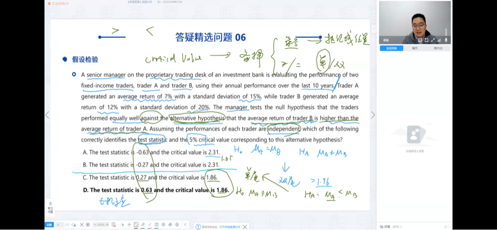 这道题的 test statistics我求的是-0.63,应该用0.07-0.12吧