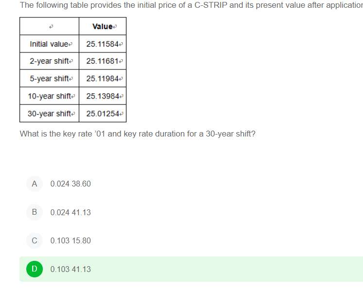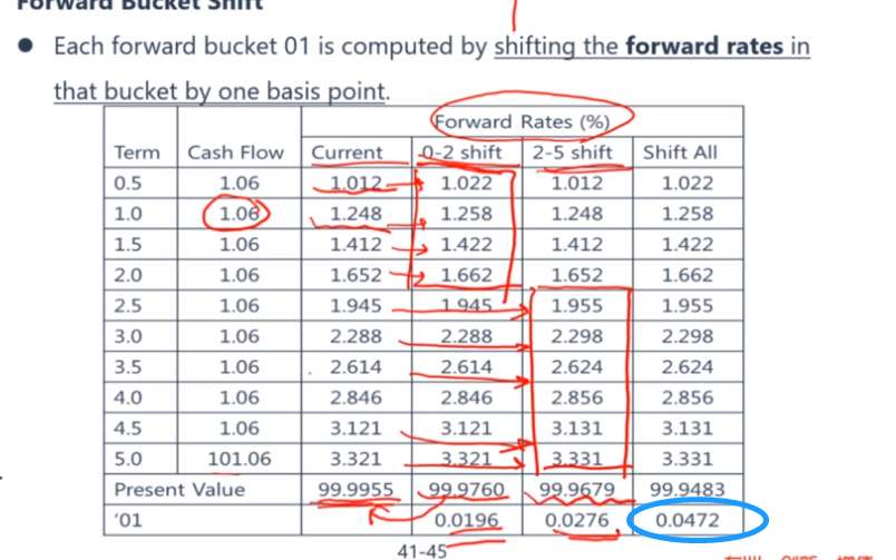这里跟这章后面的练习题,我不太分得清。这里的DV01是所有期限的都同步提高了1基点才用现在的价格-初始价格=DV01。但是后面这个例题求30年KR01直接就只考虑了30年的,没把其他年份的算进来。是否可以理解DV01=各关键利率的KR01相加之和?