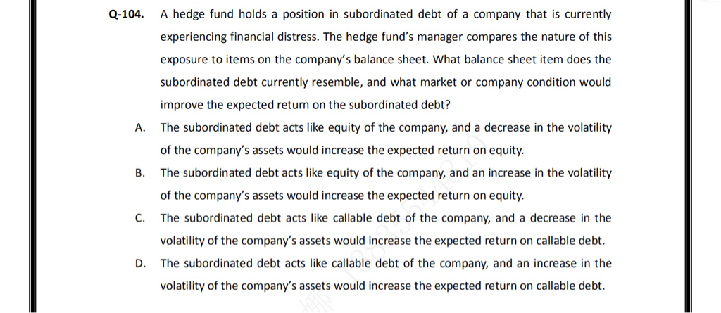 老师,这个题我的想法是equity可等价于call,当波动率上升,call价格增加,则equity价格上升,那么题目中的预期收益是折现率呢?还是说什么呢?如果是折现率是不是降低