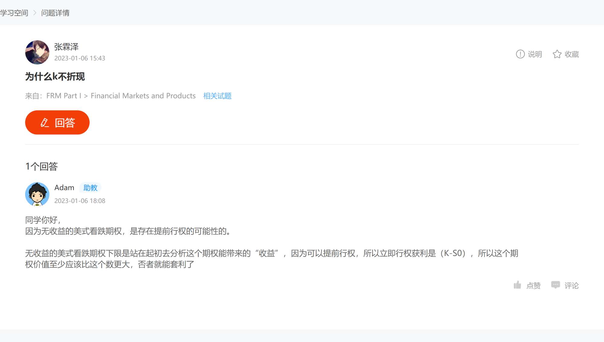 FRM问答包含在线课程、FMR通关课程、FRM试题等所有FRM相关问题,每个问题老师均会在24小时内给出答疑回复哦!