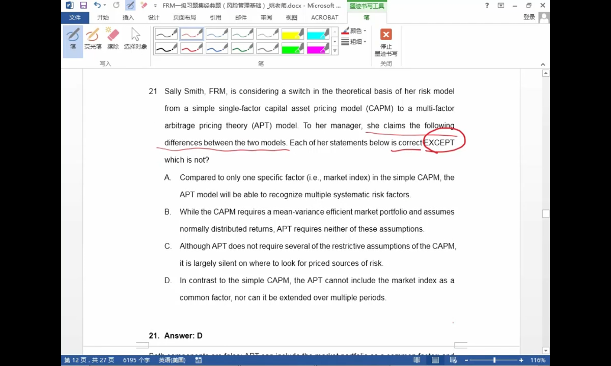 21题的B选项和13题的c选项对比,为什么13题表述CAPM是apply to inefficient portfolios,但是21题B选项说CAPM是effficient?麻烦具体解释下