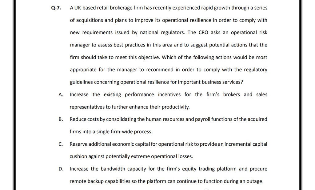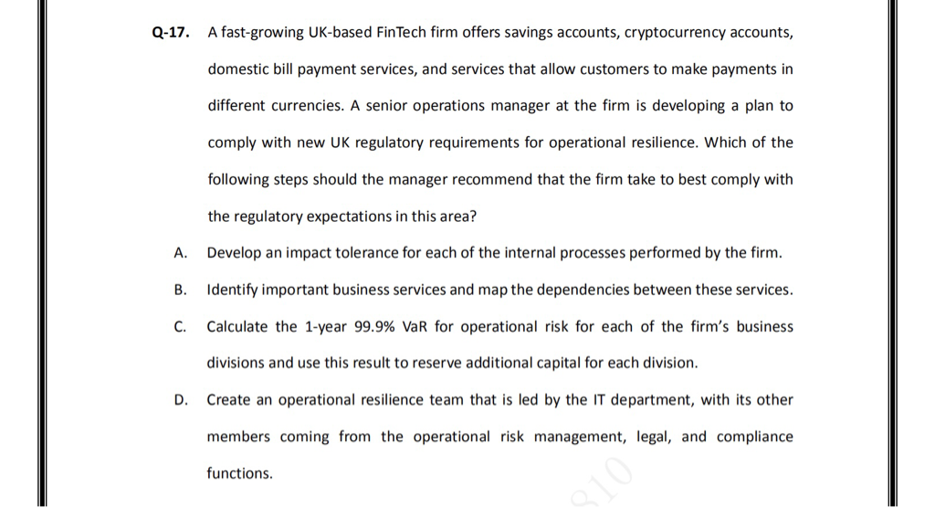 老师,C项答案中说“操作弹性不包括额外资本要求”,那么是只有操作风险可以有额外资本,弹性没有吗?还有D项操作弹性团队不是应该保持独立吗?为何由IT不部门领导?