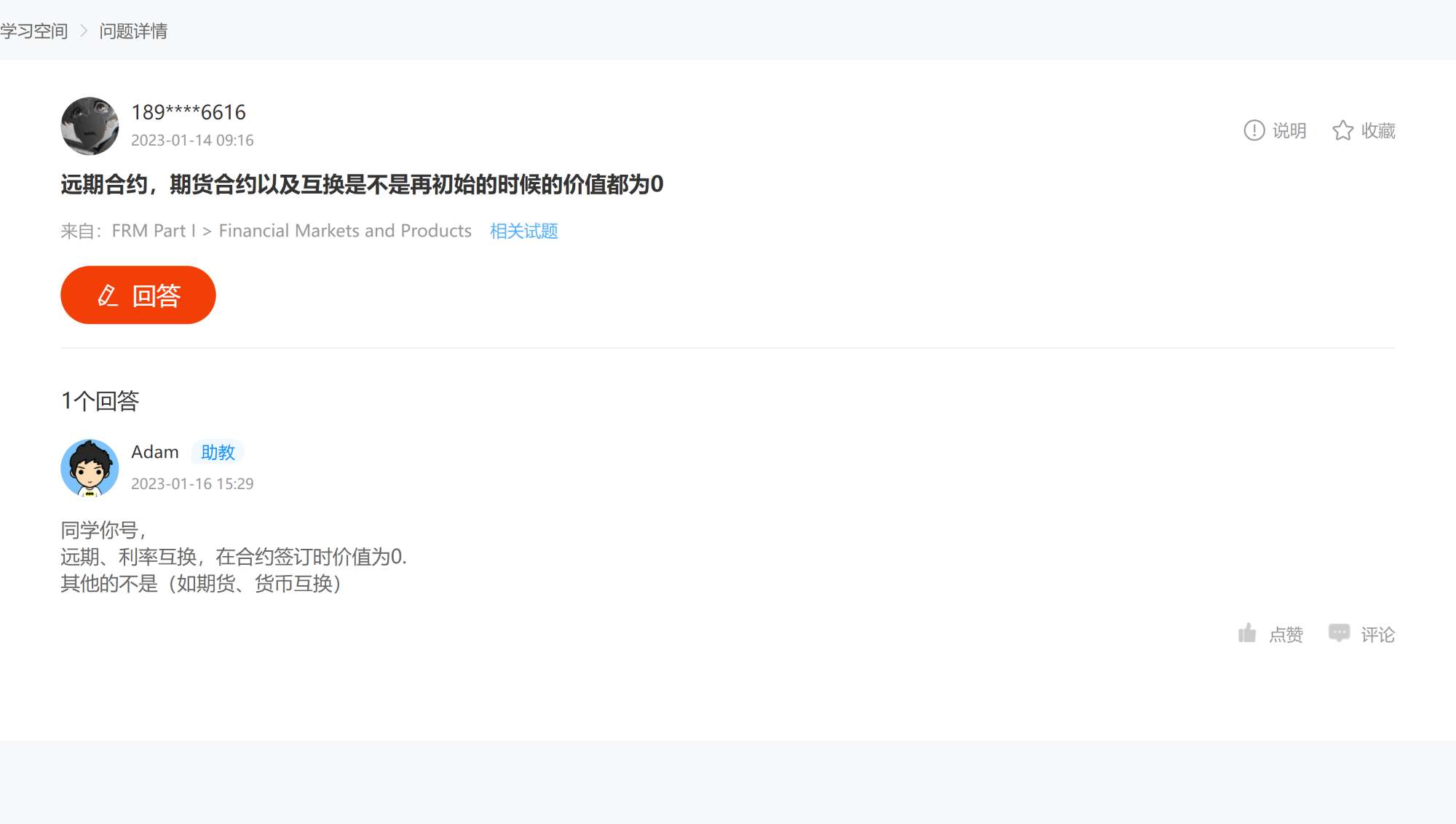 FRM问答包含在线课程、FMR通关课程、FRM试题等所有FRM相关问题,每个问题老师均会在24小时内给出答疑回复哦!