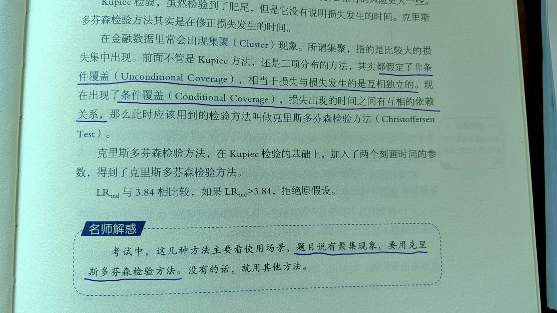 视频里老师说:非条件检验不能捕捉异常值的时间点,也不关心异常值的独立性和相关性,但会考虑异常值的聚集度。后面两个半句是不是和图片里的说法不一致呢。非条件检验假定损失与损失是互相独立的,这不是考虑了独立性和相关性了吗?还有图片说有聚集现象的要考虑克里斯多芬森的条件检验,这和老师说的非条件检验要考虑聚集度也矛盾了。该怎么理解呢