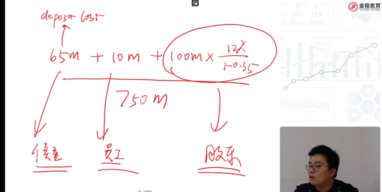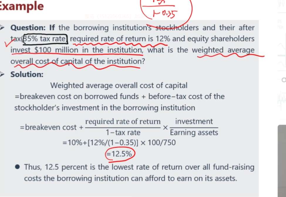如果考试遇到这个earning asset怎么思考呢?这个是要求必须nondeposit的cost的一部分吗?结合这个题的背景,我认为这个例题的equity的100million的投资应该不在750中,那样再算这100million的收益应该是[100/(750+100)]*[12%/(1-35%)].因为股东投资的100million不属于nondeposit