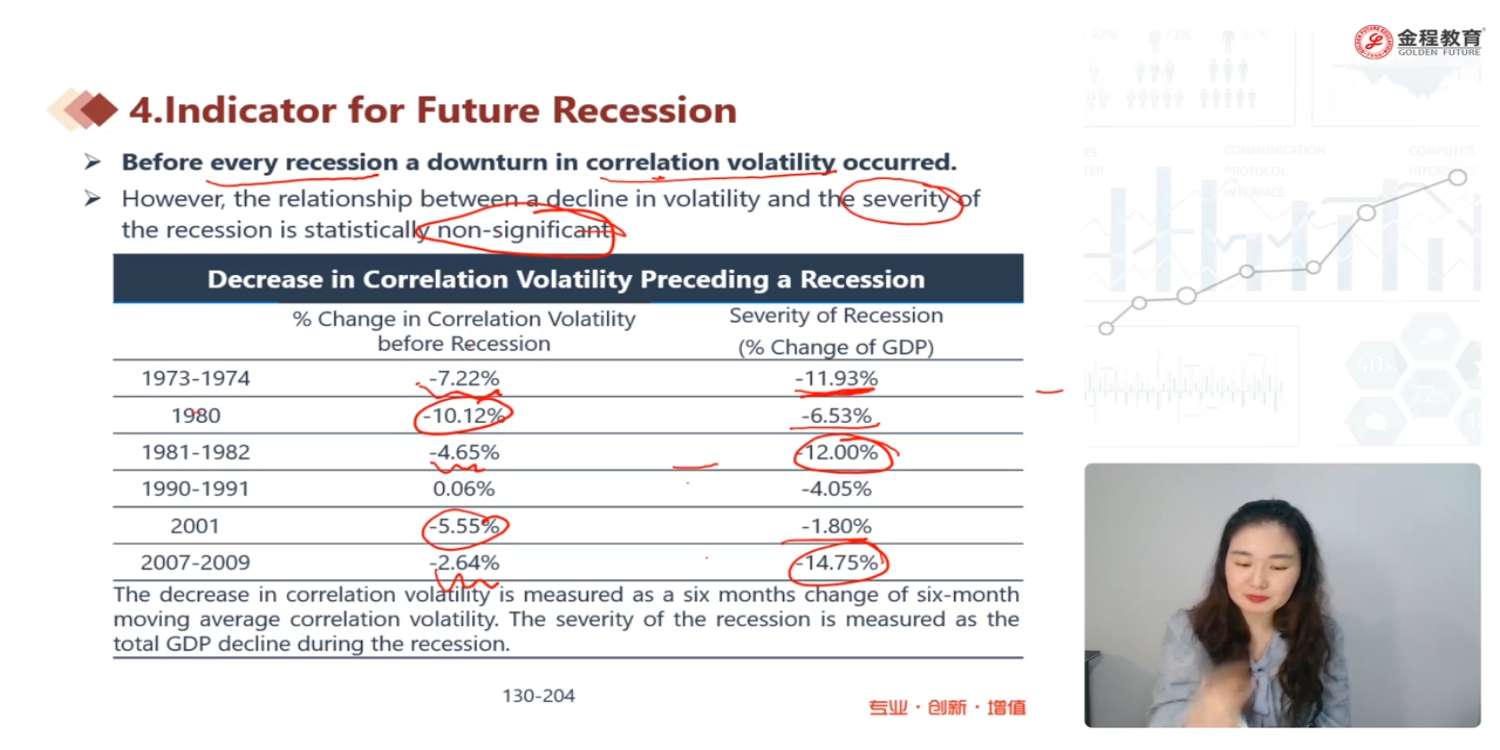 这里说每次衰退之前,相关系数的波动率会下降。但是前面实证结论第二点说的是经济状况和相关系数的波动率呈负相关关系。是否矛盾?怎么理解这两个结论?