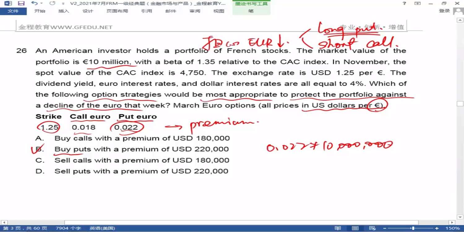 1.为什么担心欧元下降,要么用long-put,or short-call呢?2.这题为什么这么算,其他条件都没用吗?
