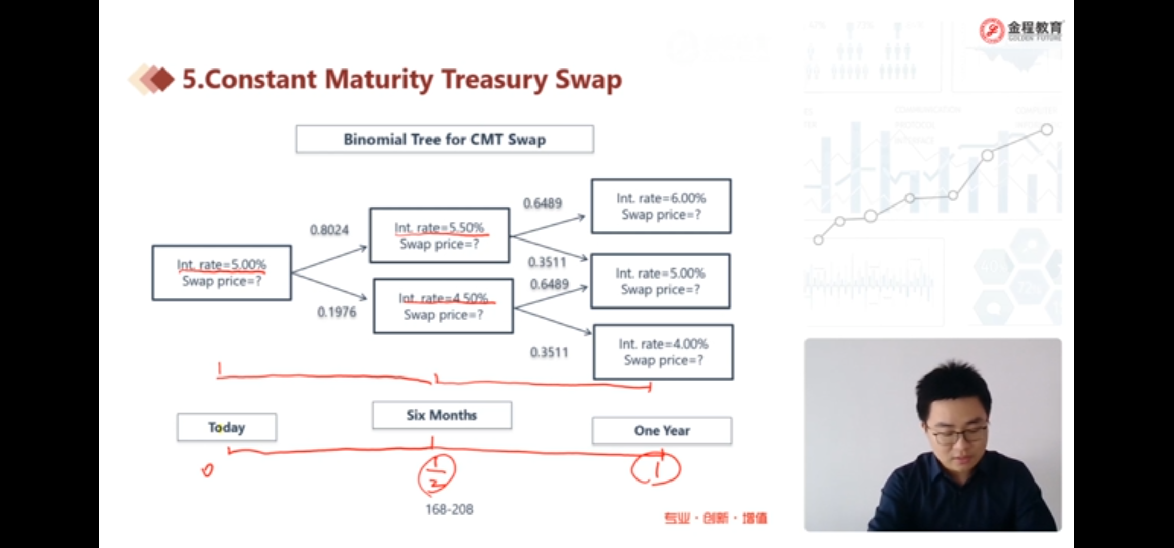请问老师,这里周老师说5%、5.5%、4.5%都是年利率,步长是0.5年,那0-1的利率不应该是5%吗?怎么变成0-0.5是5%,0.5-1是5.5%或4.5%?