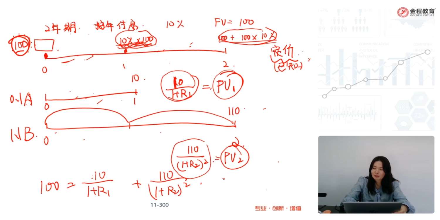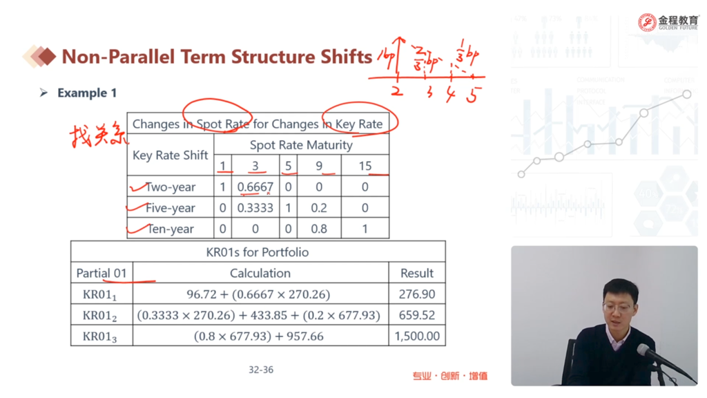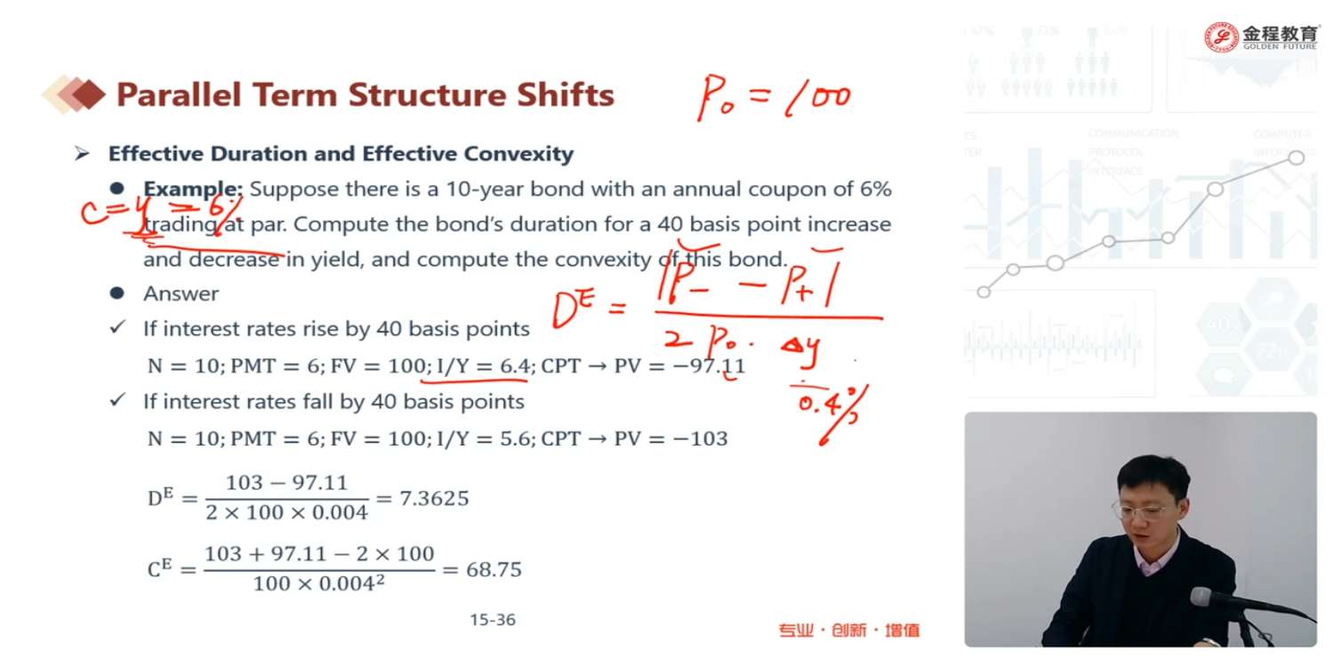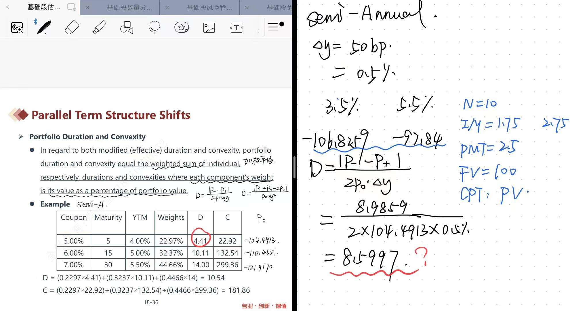 老师,如果按照effective duration算例子中的第一行数据,就是我右边写的那个,假设半年付息,y变化50bp,算出来的duration错了好多,我不知道为什么?