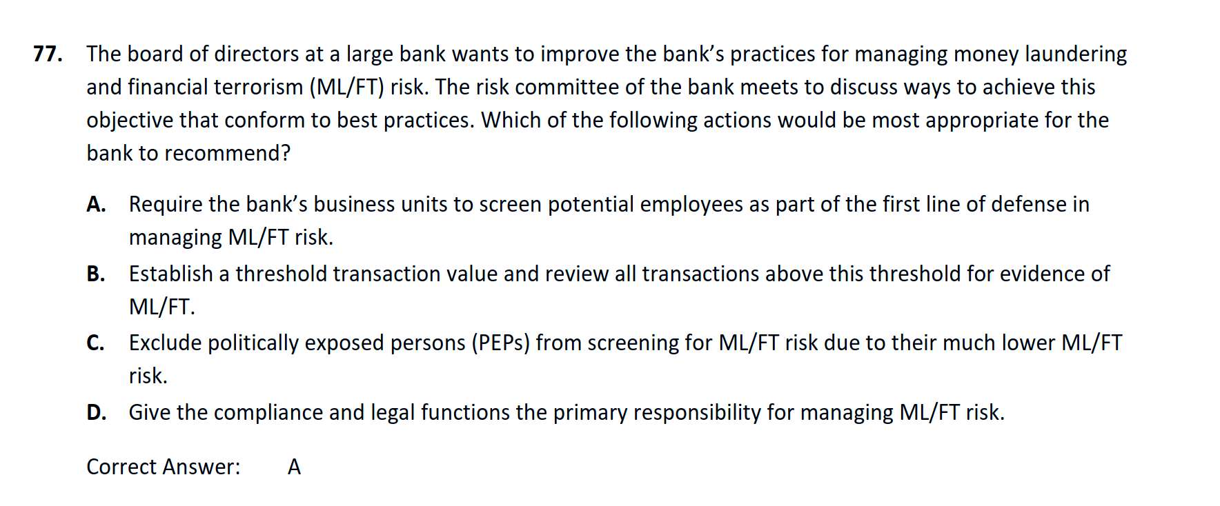 官网习题,screen employee是怎么做的?如果员工没有在银行有account,怎么screen?一般在银行,也只是针对大额交易的账户进行监控,对于小额和无交易账户并不监控,这个解析和实际业务并不一致。