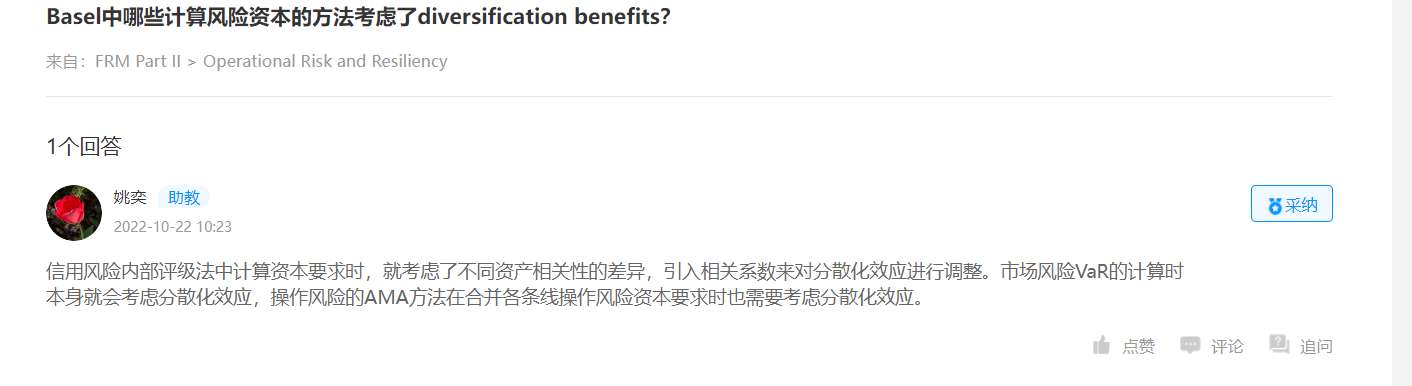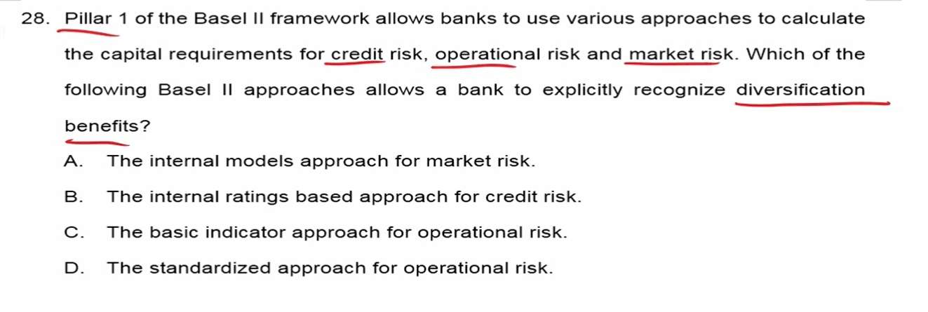 28题的B选项为何不对。我之前提问过Basel中哪些方法考虑了Diversification benefits(见图2),老师回复信用风险中的内部评级法是有分散化效应的。哪种解释才是对的?谢谢!