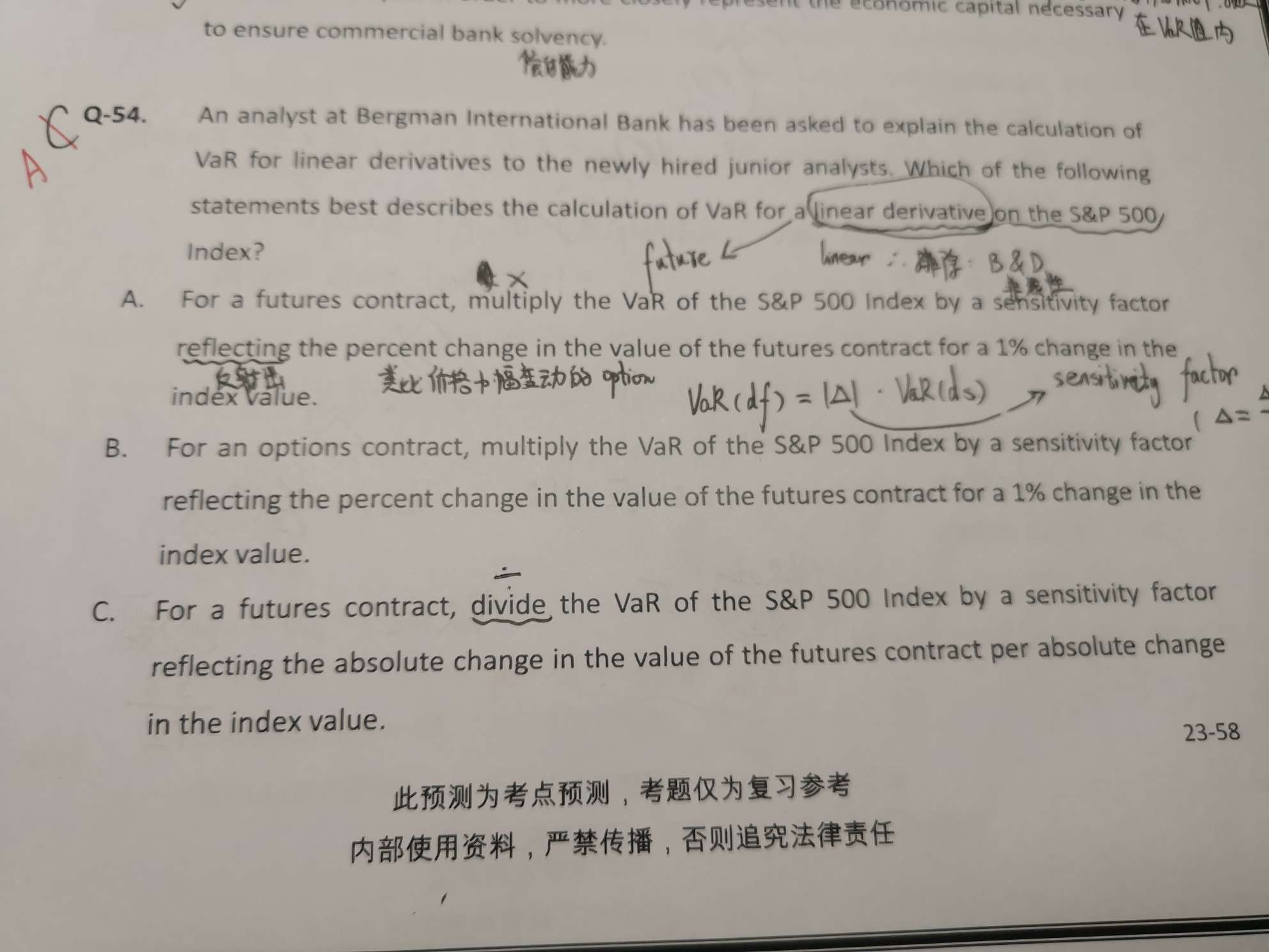 1, 根据公式, option的Var是用德尔塔来×underlying stock的Var。2, Option 的var的计算中,如果只考虑Delta,那么这个option是线性的model吗?3, A选项是for a future contract, 根据公式,future contract, Var计算,不是用德尔塔?是用modified duration×price×underlying var。