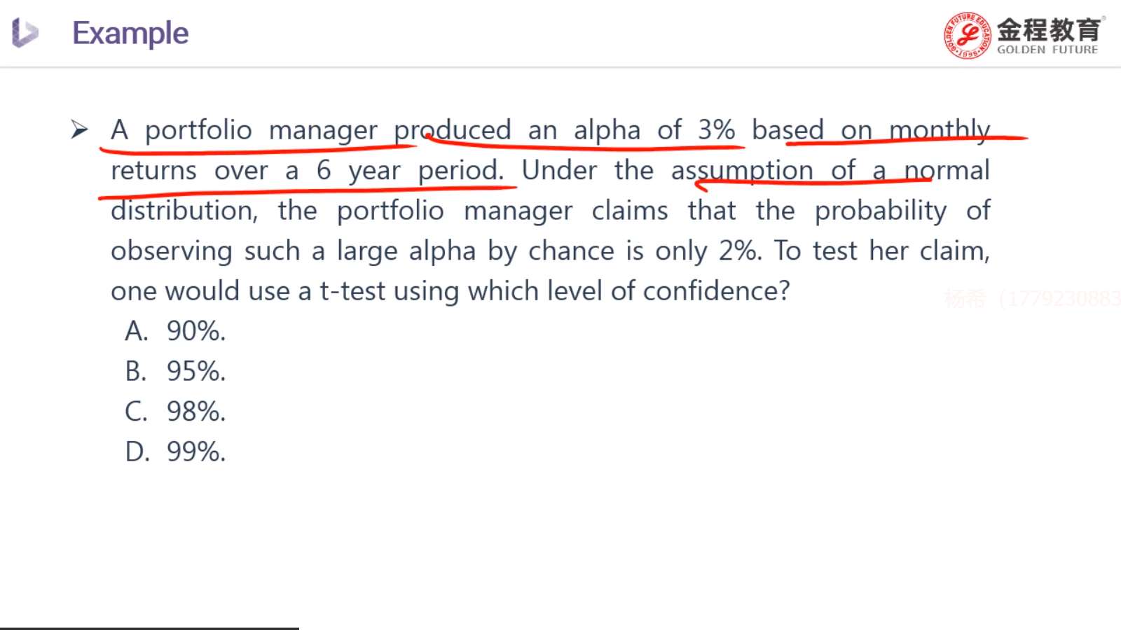 请问本题中说的是normal distribution假设下是2%,而使用t检验的进行检验时相对于正态分布是肥尾,难道不应该选99%吗?