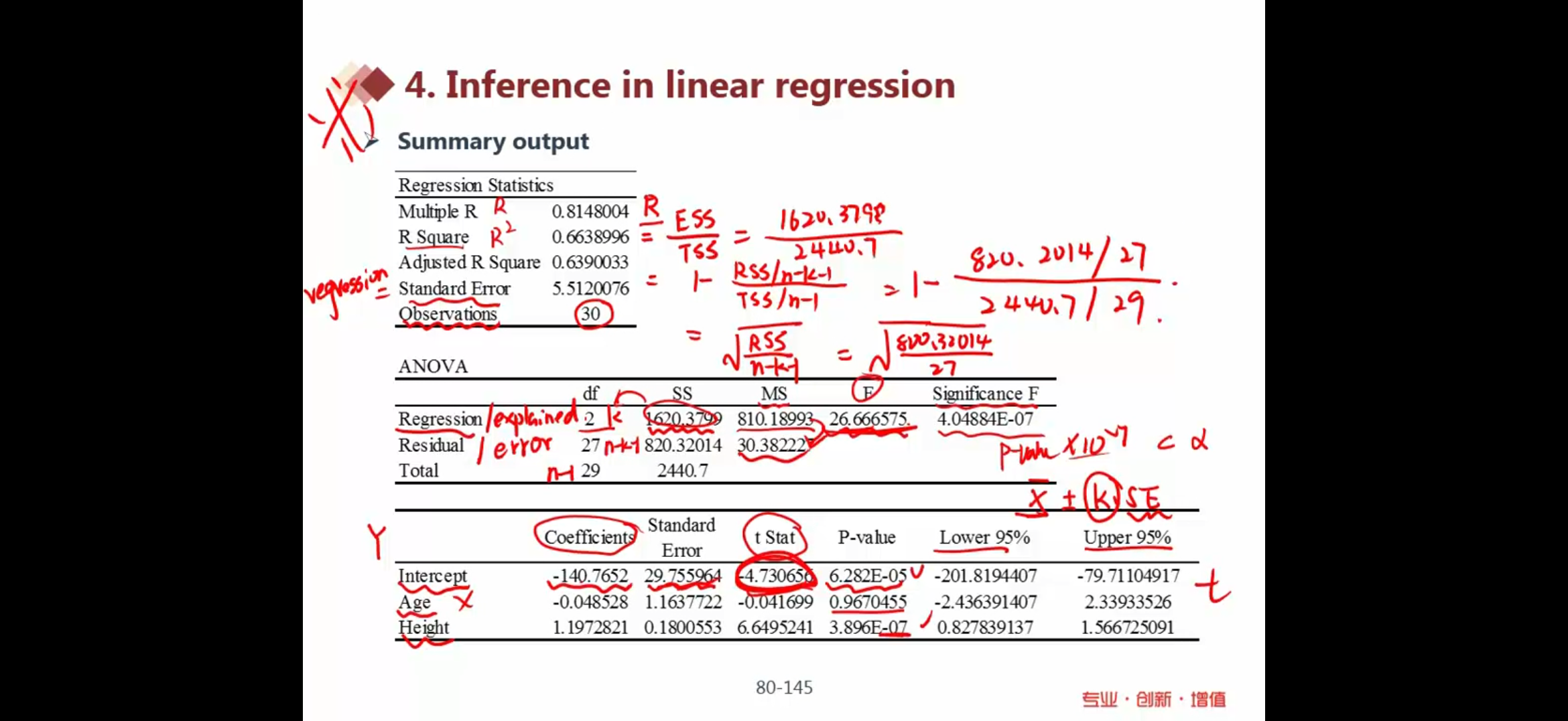请问右下角的95%的上下限是跟第一列去比吗?这样比的话三个系数都落到了置信区间?我们算出第三列的t值不是应该跟一个关键值k去比么?为什么要算出x拔加减k×标准误?