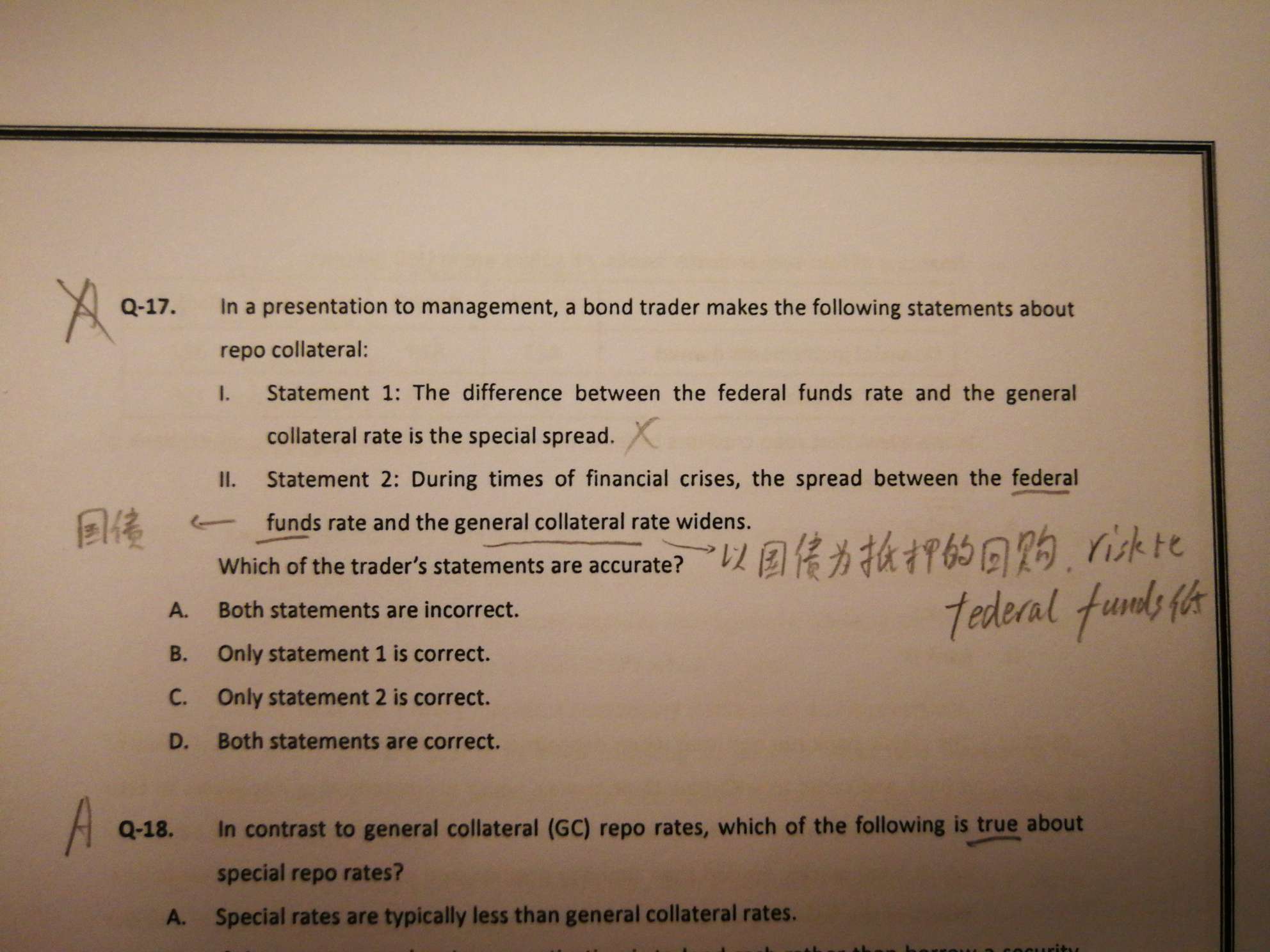 请问老师,17题的说法2,怎么理解老师说的“federal funds是国债,GC是以国债为押品的回购,风险比federal funds低”?