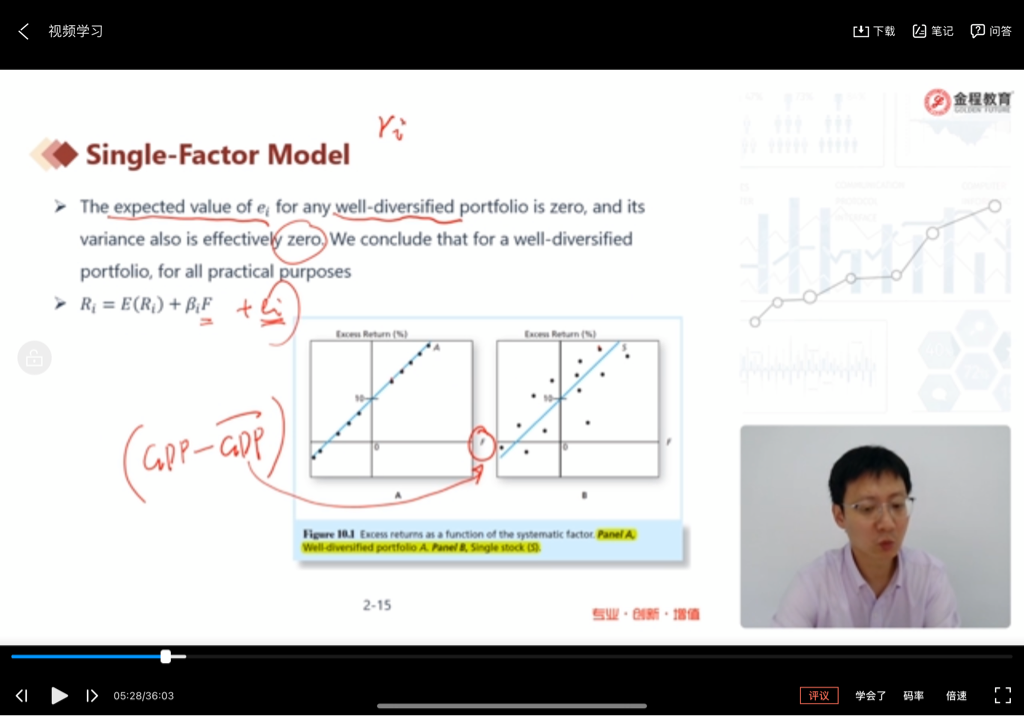 请问两张图片中,图A是一个well diversified组合,那么gdp的偏差只会带来线性的变化不会带来像图B中ei带来的波动吗,为什么?两个图中的每一个黑点分别代表什么呢?