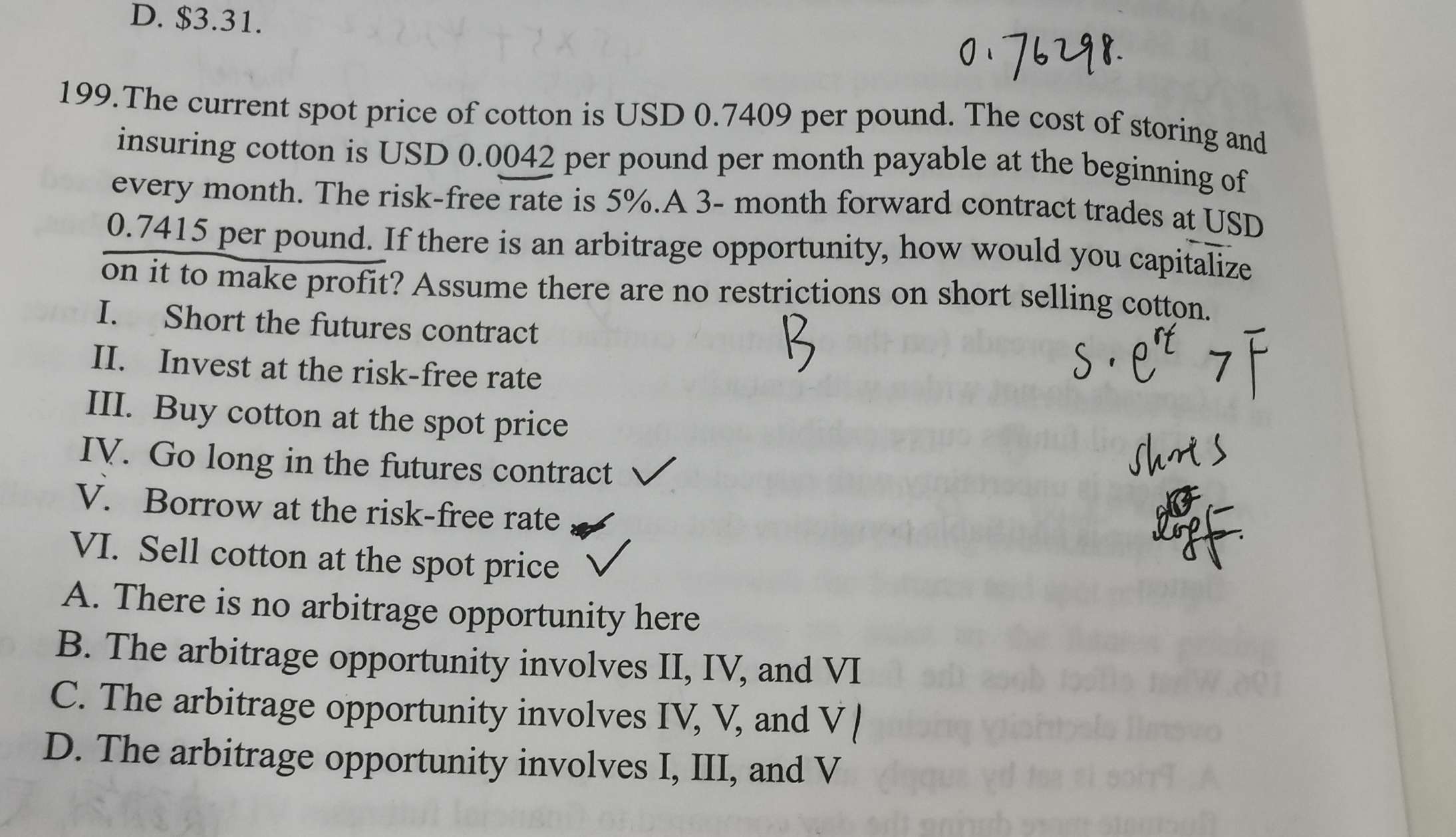 这题F>S*e^rt,应该short f,buy s,但为什么invest risk free呢。