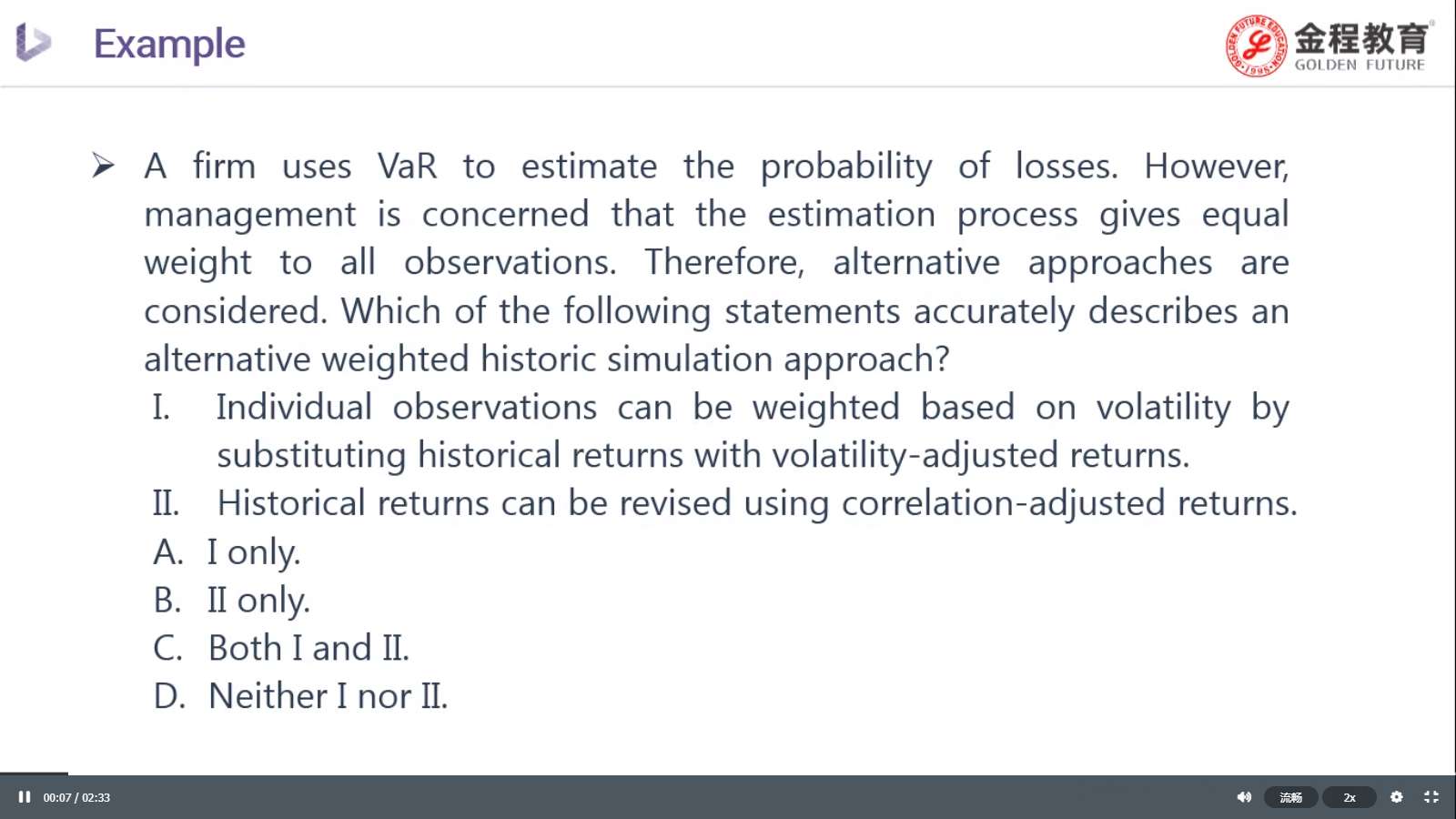 Which of the following statements accurately describes an alternative weighted historic simulation approach?题干中问的难道不是,以下哪个是描述权重变化的历史模拟法吗?两句话描述的都是数据改变权重不变的情形啊,为什么不是选Neither