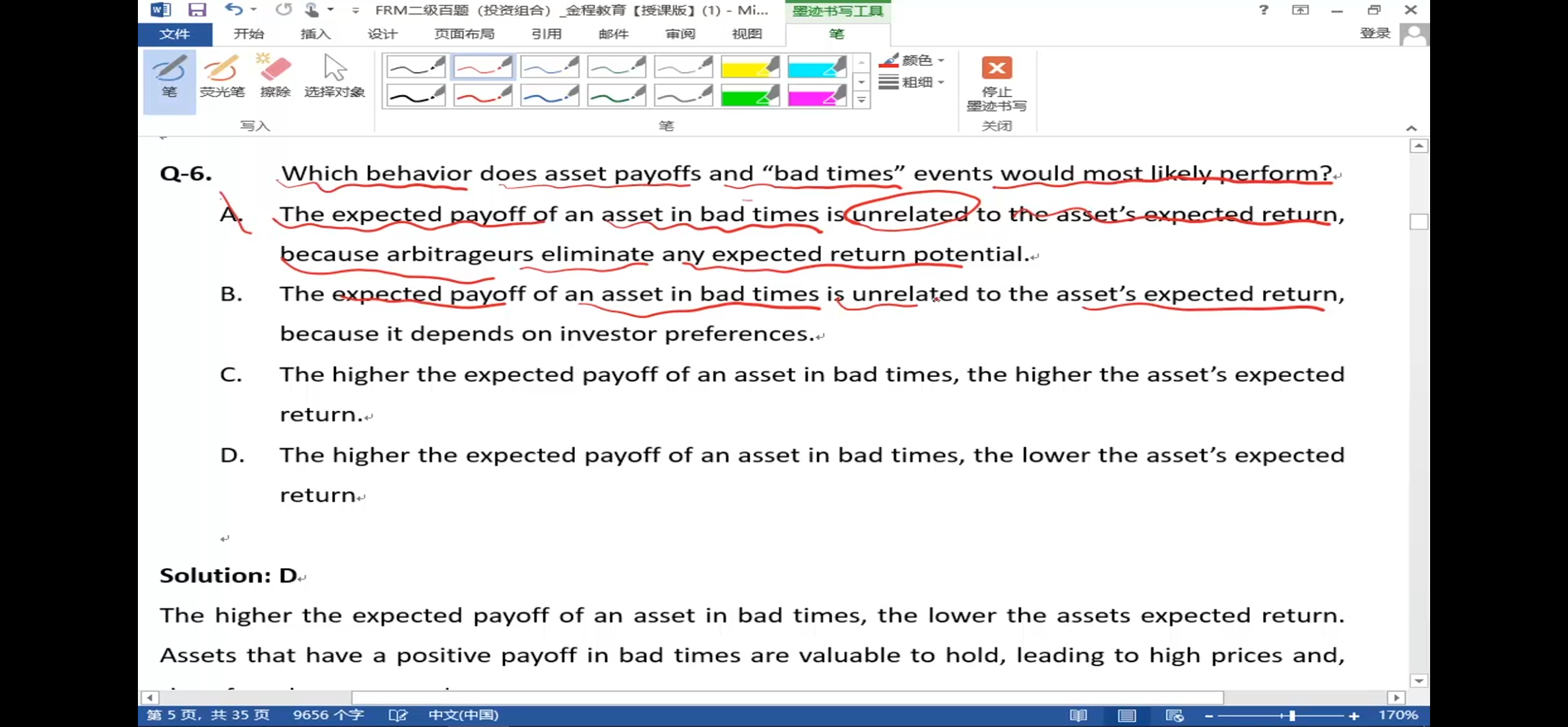 A和B选项,为什么收益与预期收益率是相关的?不是题目说了么,在bad times产生了高收益?相关的话怎么会产生高收益呢?