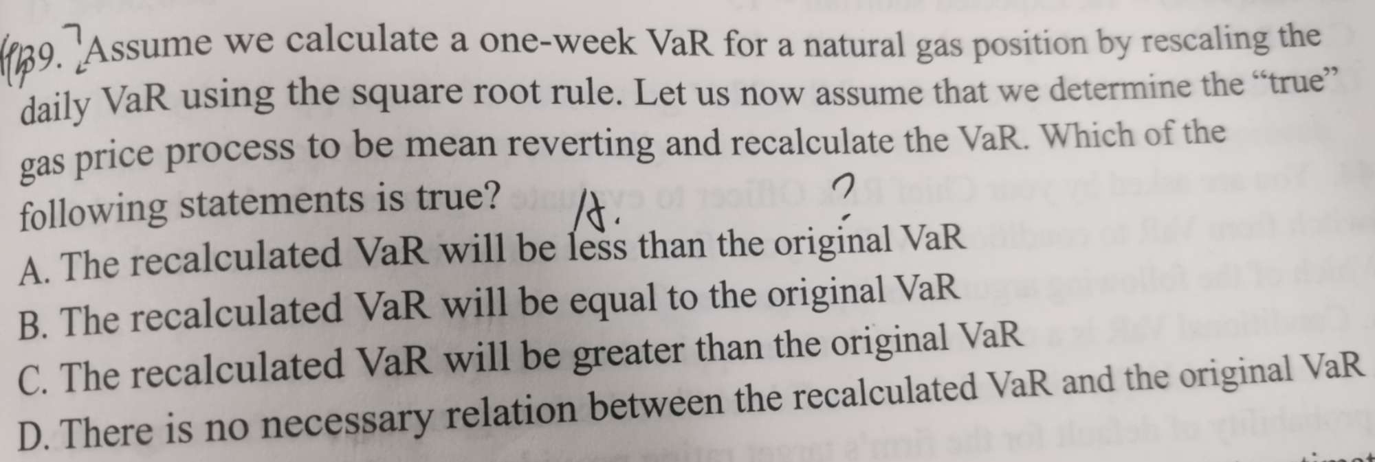 这道题答案是A,请问是因为原计算是平方根法则(相关系数为0),后面假设是reverting(相关系数为负),故重算的VaR小于原计算的VaR么,谢谢。