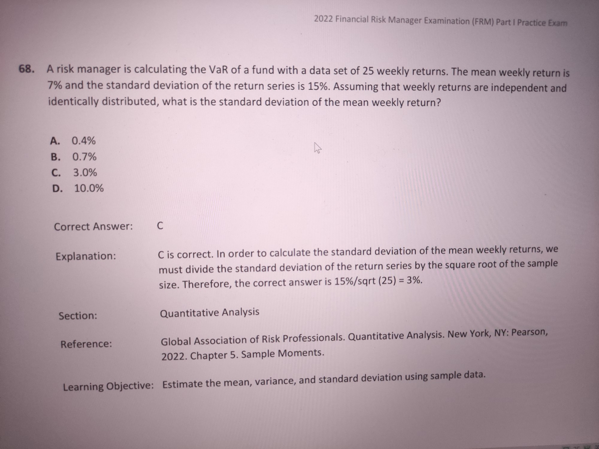 老师,这道题干没理解,是不是要求每周收益均值的标准差,如果是的话,题干中不是已经给了数据15%吗