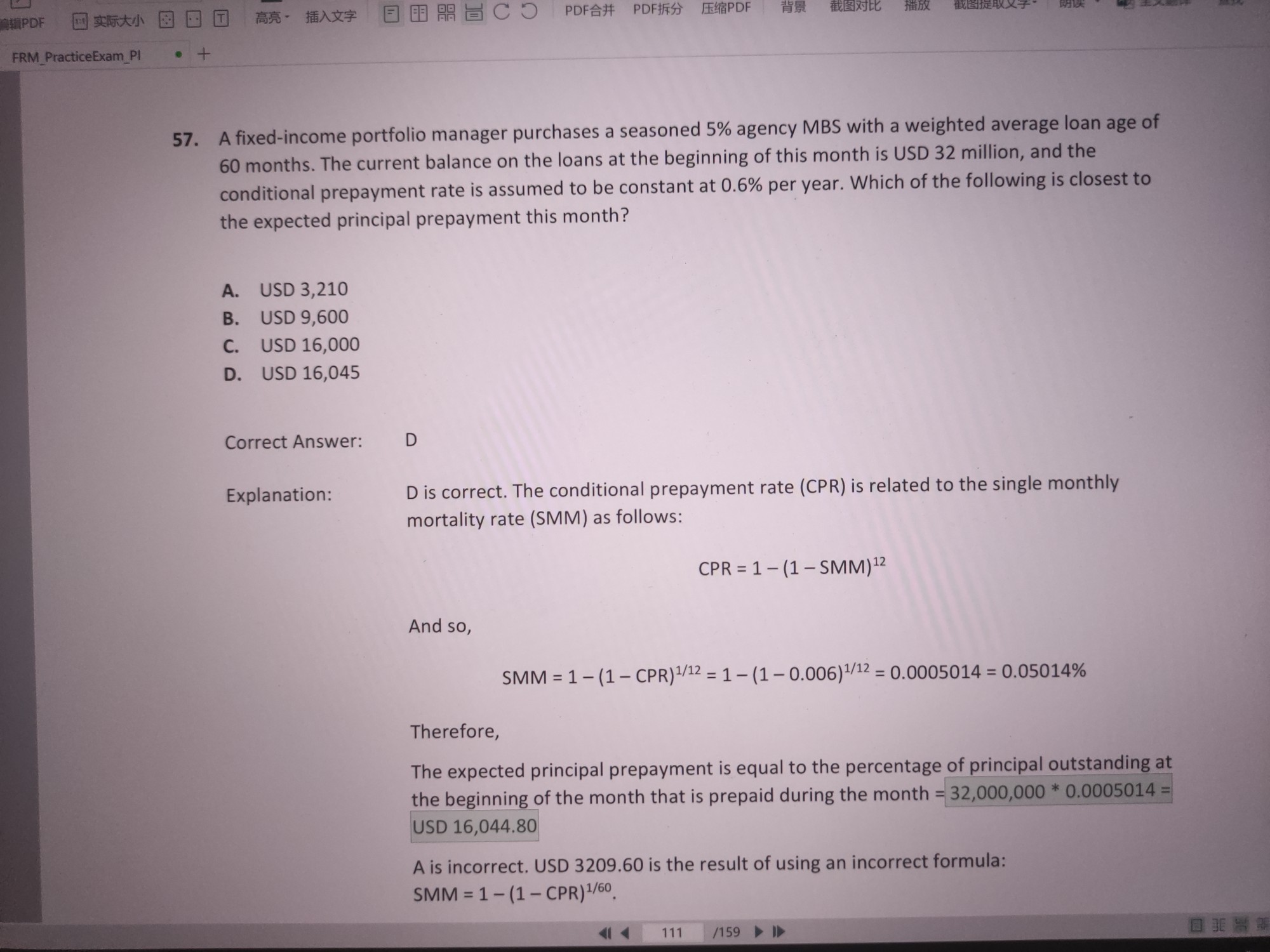 老师,这道题求提前偿付本金,答案直接用期初本金✘SMM,是不是有问题?