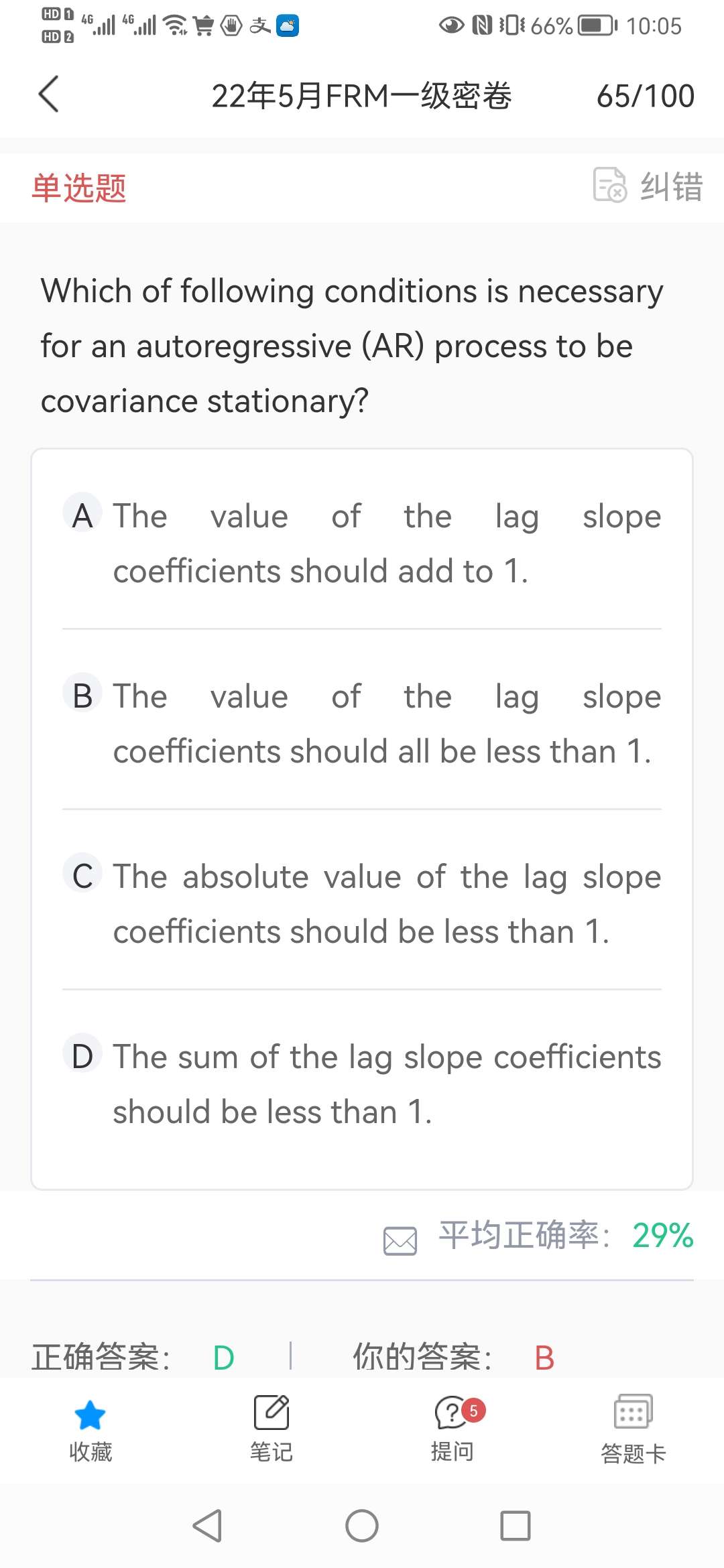 这道题强化班里老师不是说是B吗?if the roots of the function are all less than 1 in absolute value,the AR(p)model is stationary.麻烦老师确认一下~谢谢