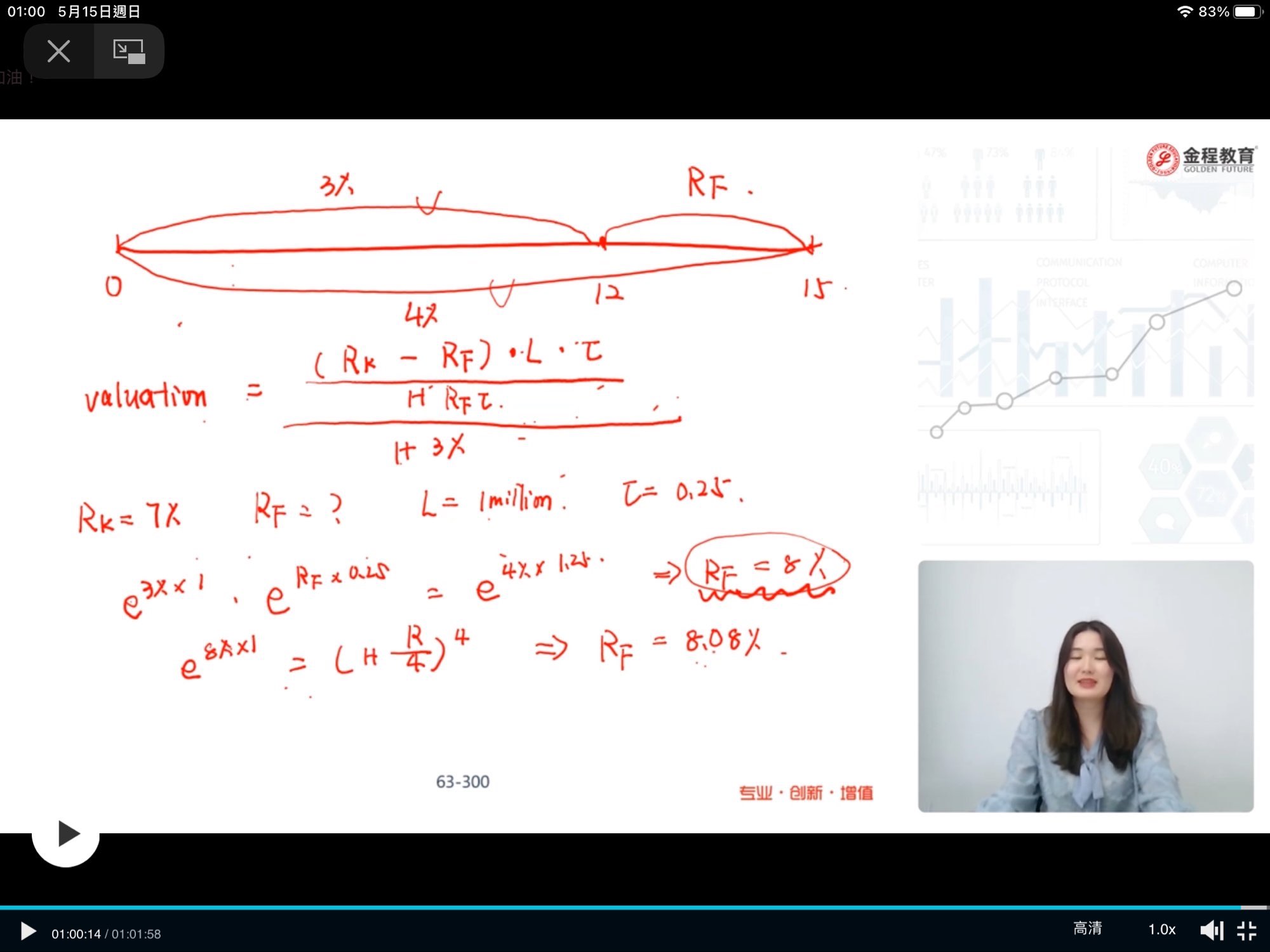 请问算valuation时的分母1+3%,(前面给的公式是val=payoff/(1+R)的t次方)R为什么是3%,t为什么是1不是0.25