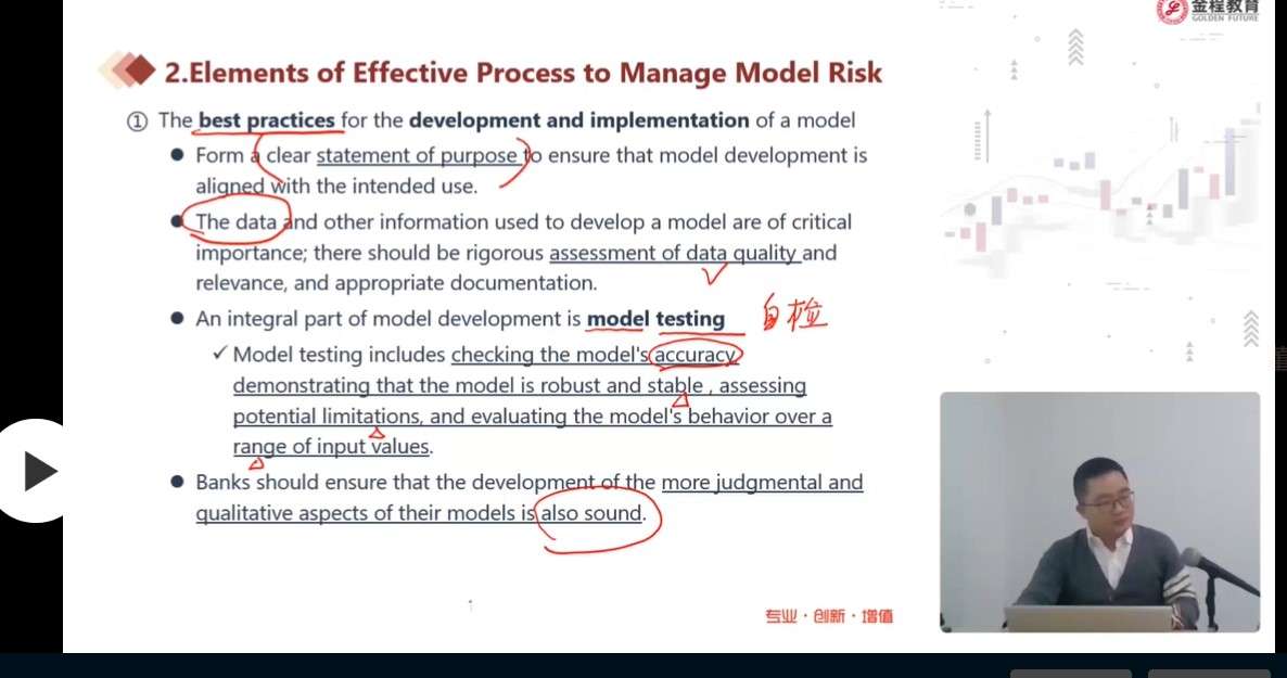 查看试题 已回答这个题说的是testing model,截图是老师说的在建立模型时要做的是先自检(model testing)自检时不需要benchmark,后面在verification中的ongoing中出现的benchmark,所以我认为这个题应该选D。我觉得就是讲义的叫model testing,这道题叫testing model,除非这两个词代表不同的概念,否则应该选D。开发模型正常的和极端的都可以test一下啊,没有说test model不能测正常数据吧,都是先满足基本的再做更难的。